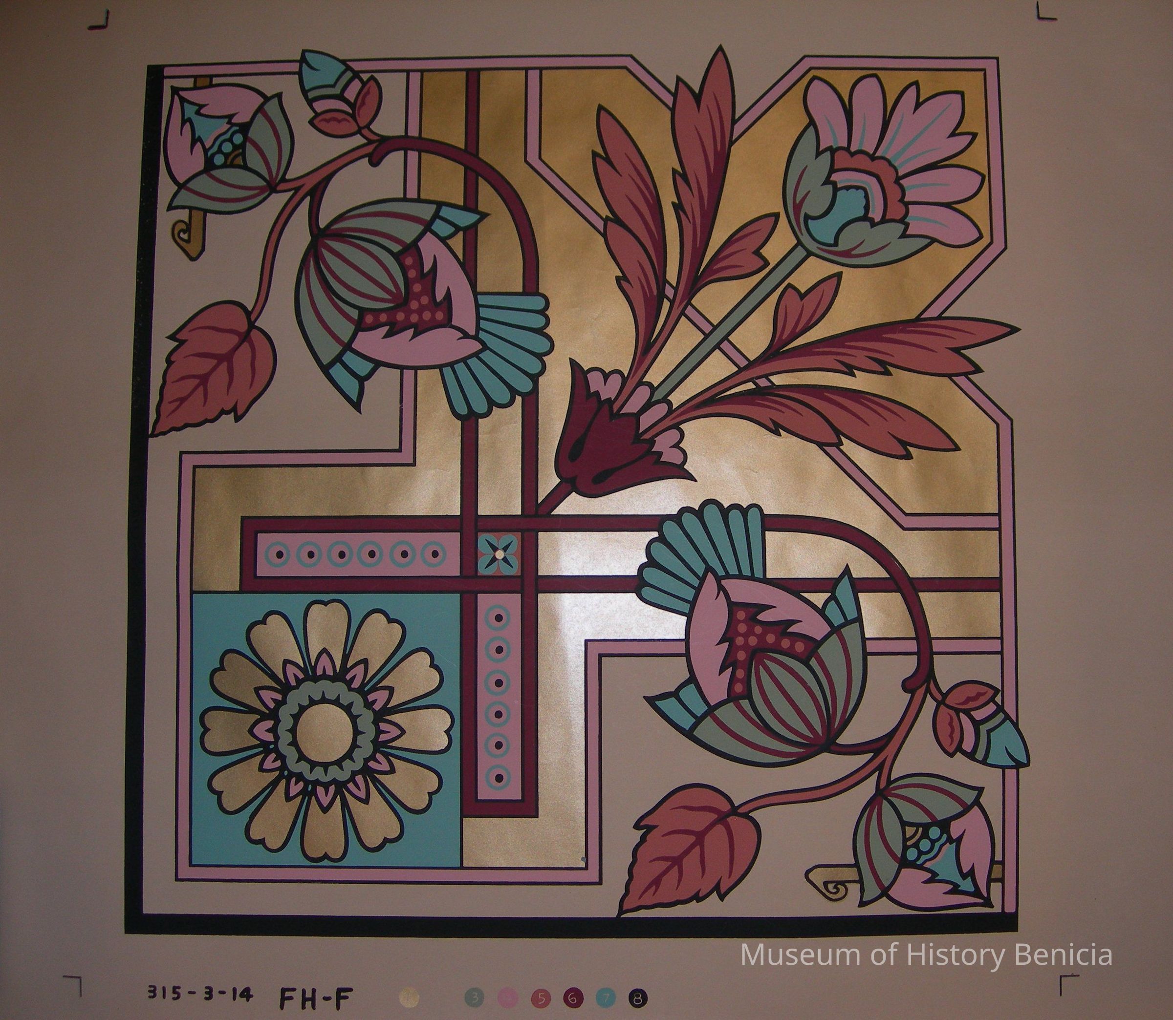 Tri Corner Design - main colors: gold, maroon, aqua, green, rust on beige background