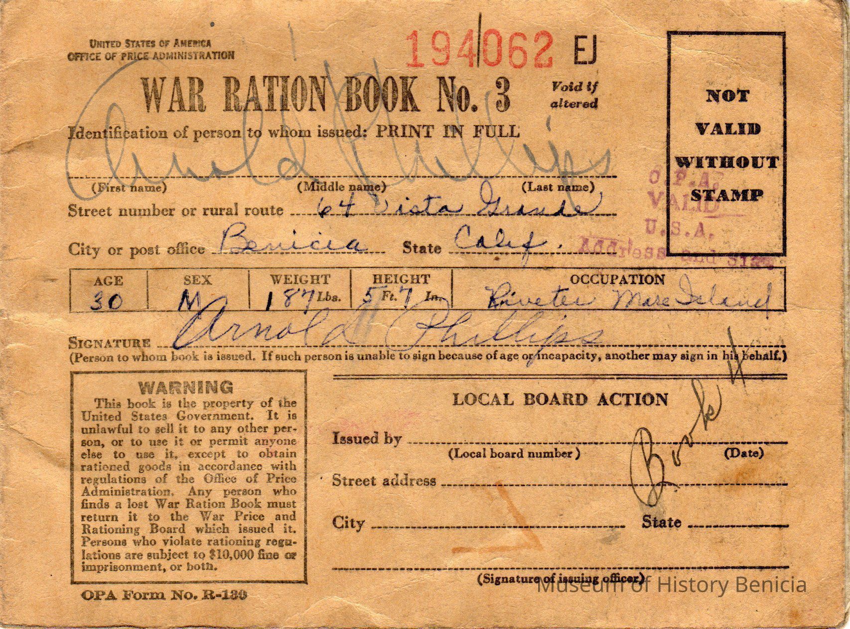 given to Arnold Phillips, 64 Vista Grande, Benicia, CA