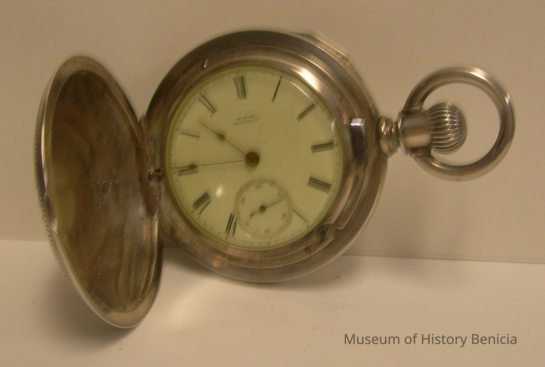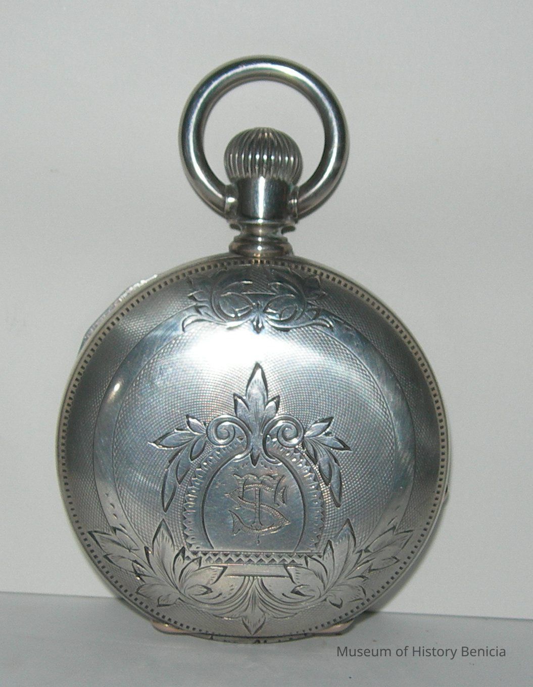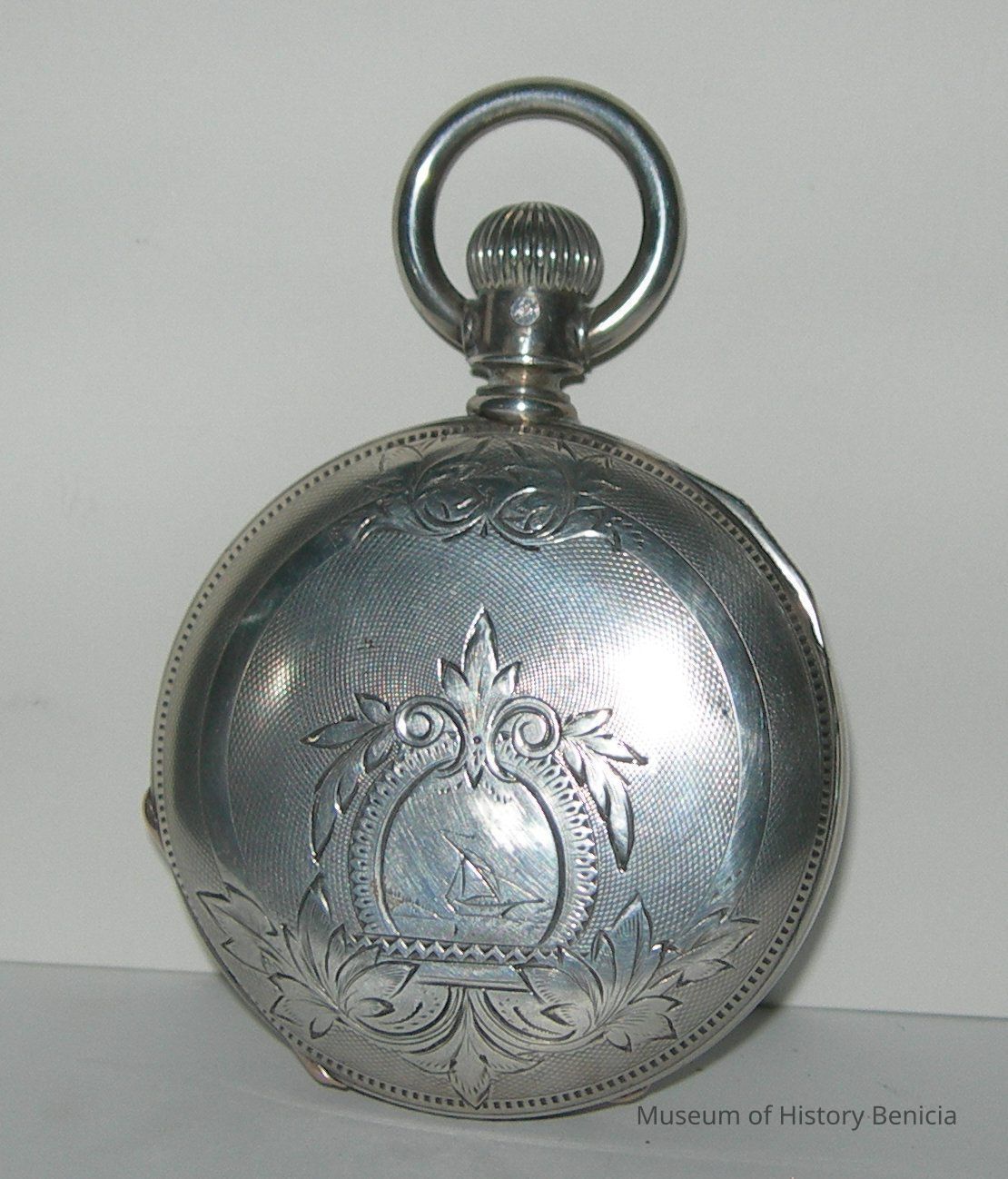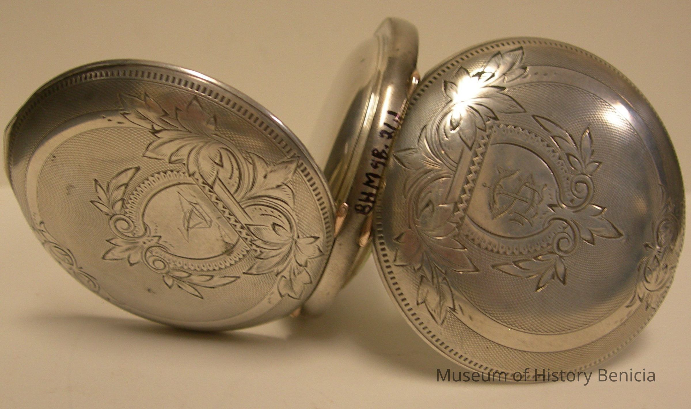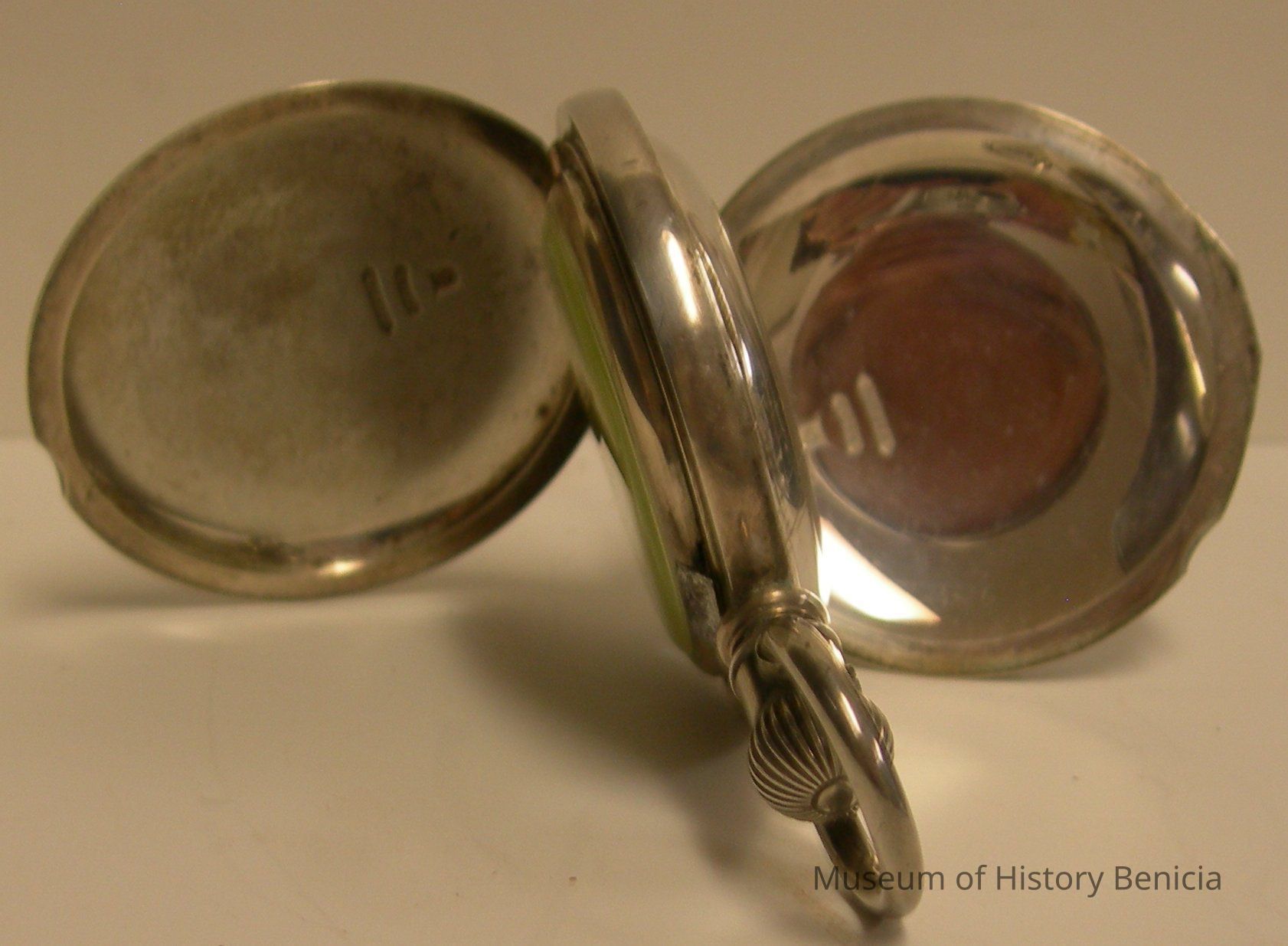 Pocket watch - "John Crum" [supposedly made as a requirement for graducation from watch making school]; it is said that the watch once belonged to a sea captain in Benicia;