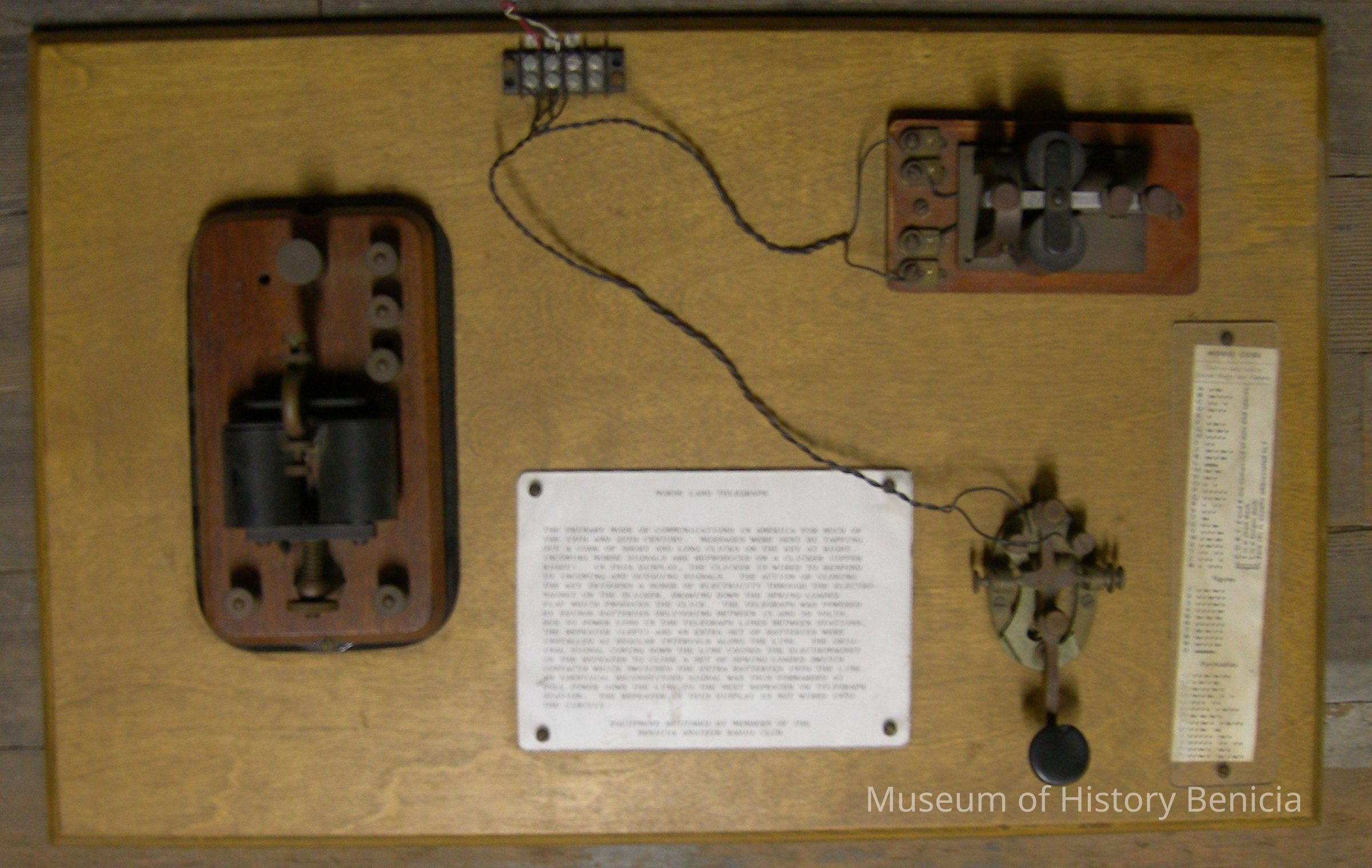 Morse Land Telegraph Instruments display. Two receiving units and one sending unit mounted on a 24" x 15" board. Includes an information sheet under plexi-glass attached to the board.Collection