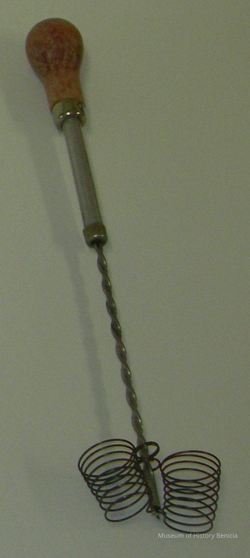 stainless steel whisk with two coils at bottom; wooden handle at top. Push handle down to make it whip.