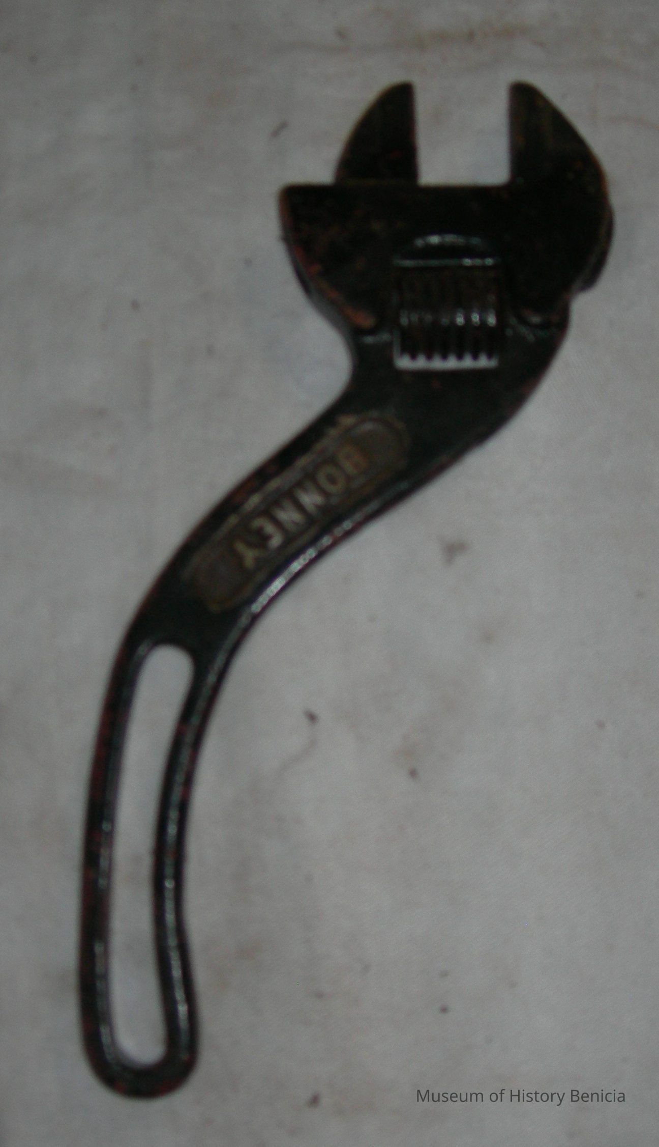 adjustable wrench (similar to a crescent wrench) possibly used in automotive repair; s-shaped handle with open space in it; painted black, "Bonney" in raised lettering on body of tool.Collection