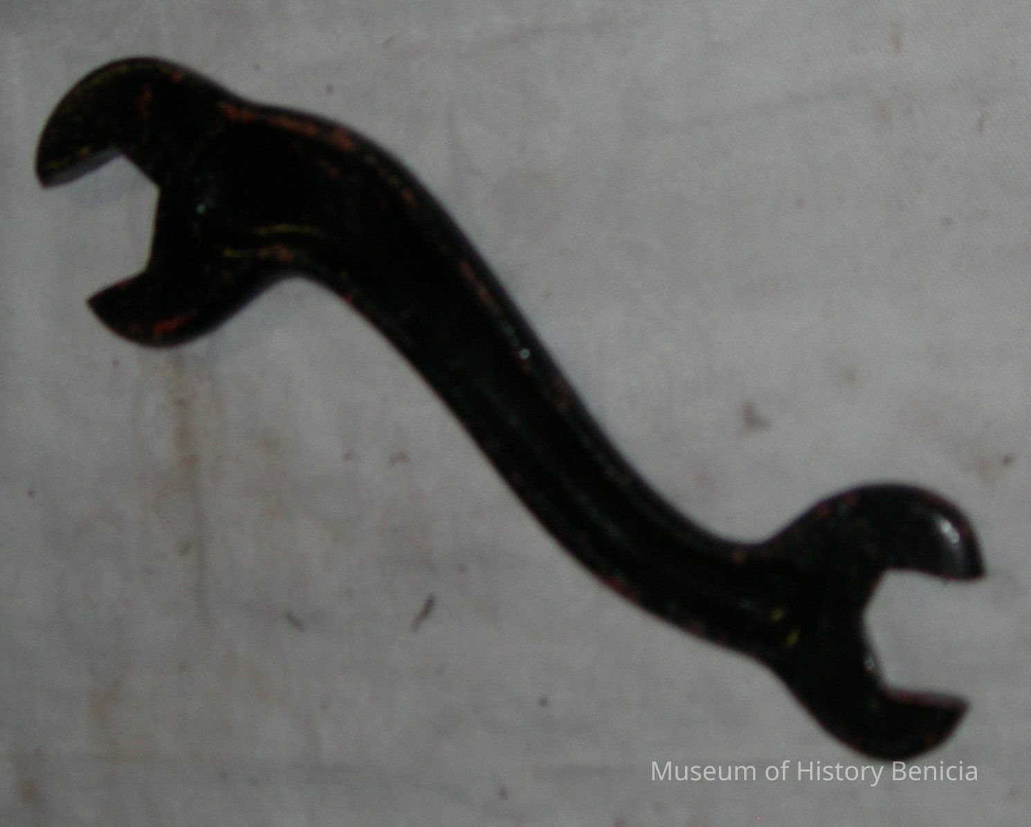 "S" shaped wrench, open ended; probably used in auto or truck or tractor repair; painted black some rust