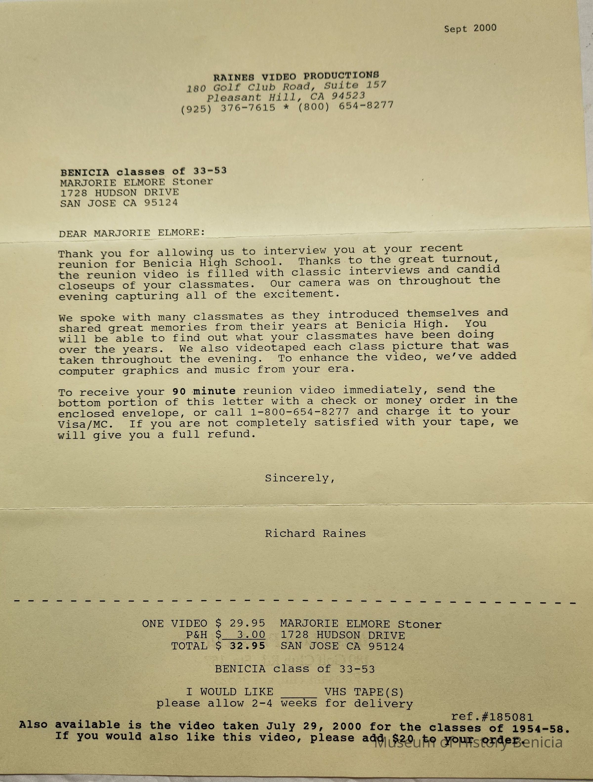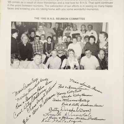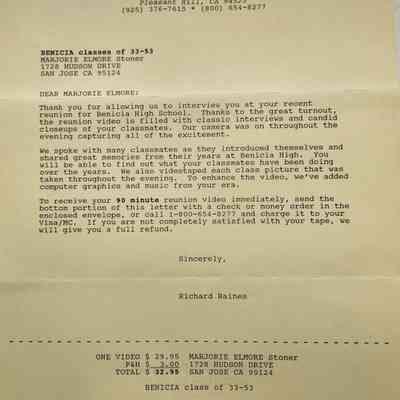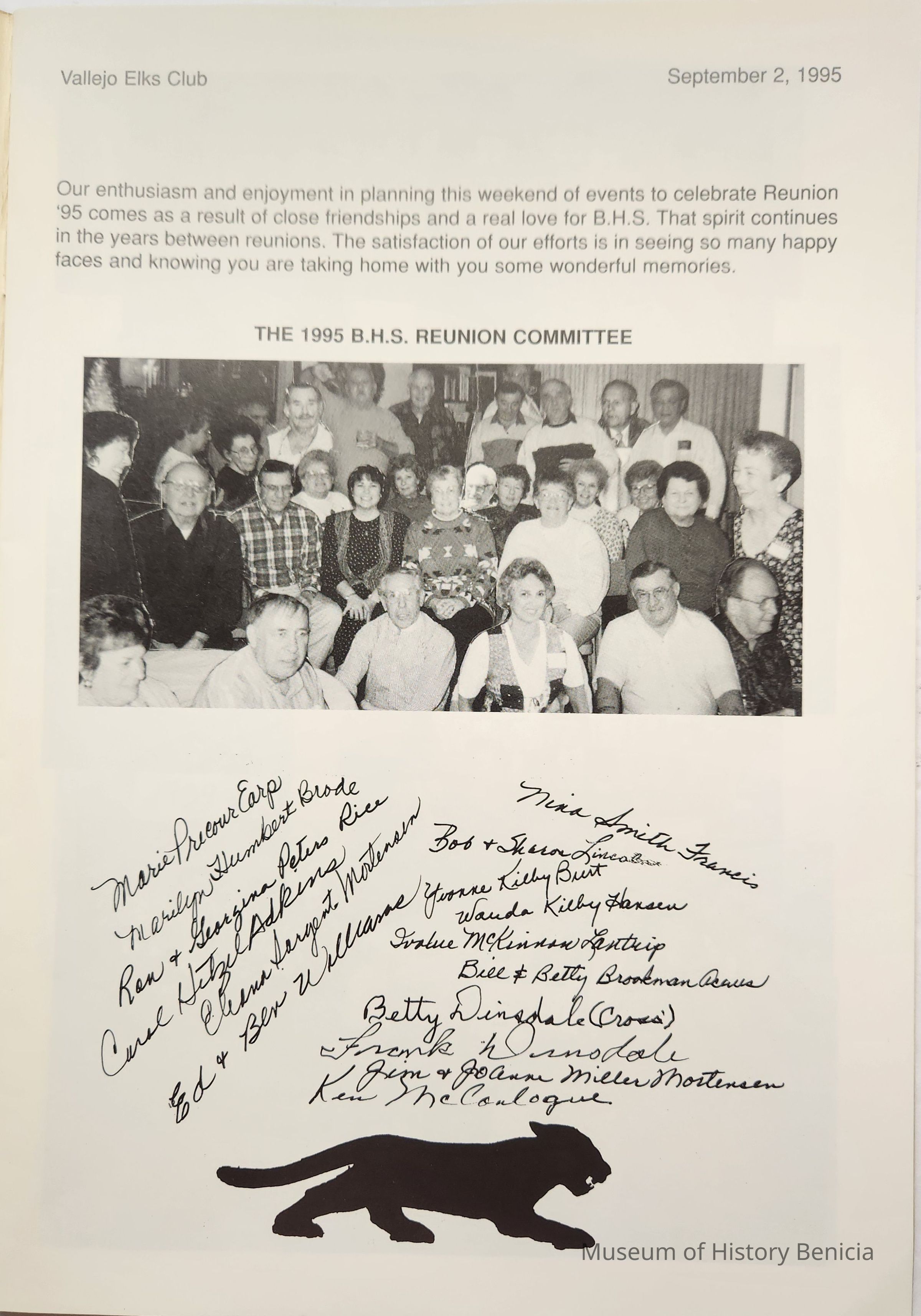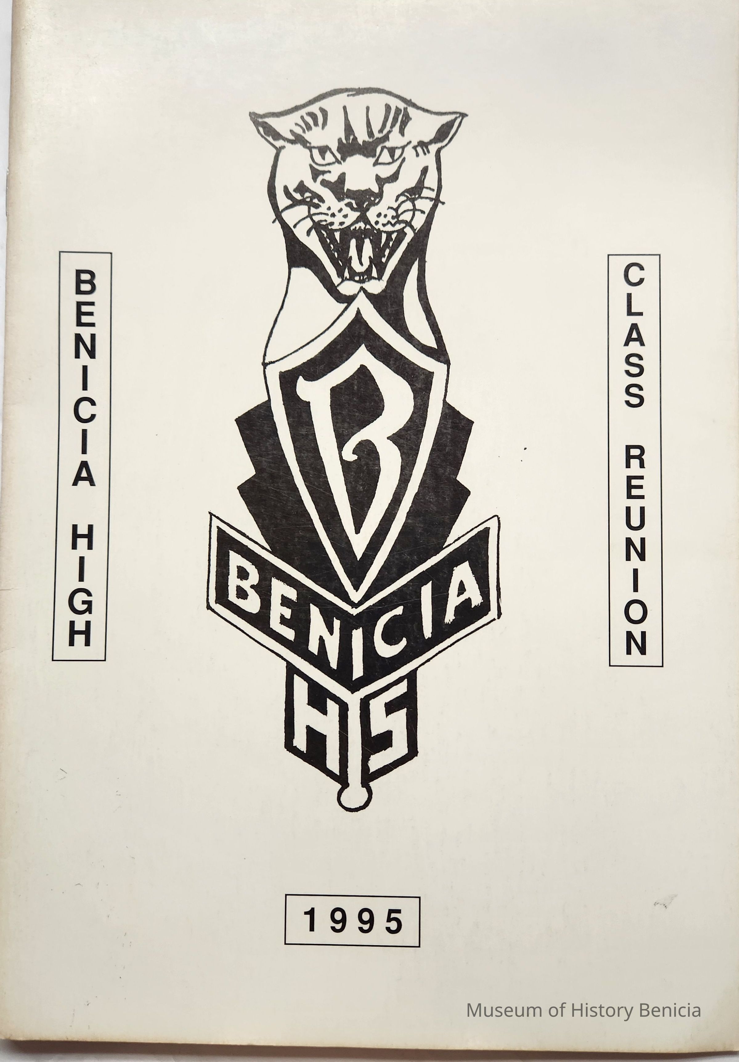 Souvenir Yearbook from a 1995 Reunion of the BHS Classes of 1933 - 1953 (other years were represented as well). Included are photographs, both posed and candid, along with names and addresses of the attendees. The cover is black on glossy white: Benicia High Class Reunion 1995 with a drawn logo in the center. There are 28 pages. The reunion took place at the Vallejo Elks Club on September 2, 1995. Included is a letter to Marjorie Elmore Stoner from Raines Video regarding a reunion video.Collection