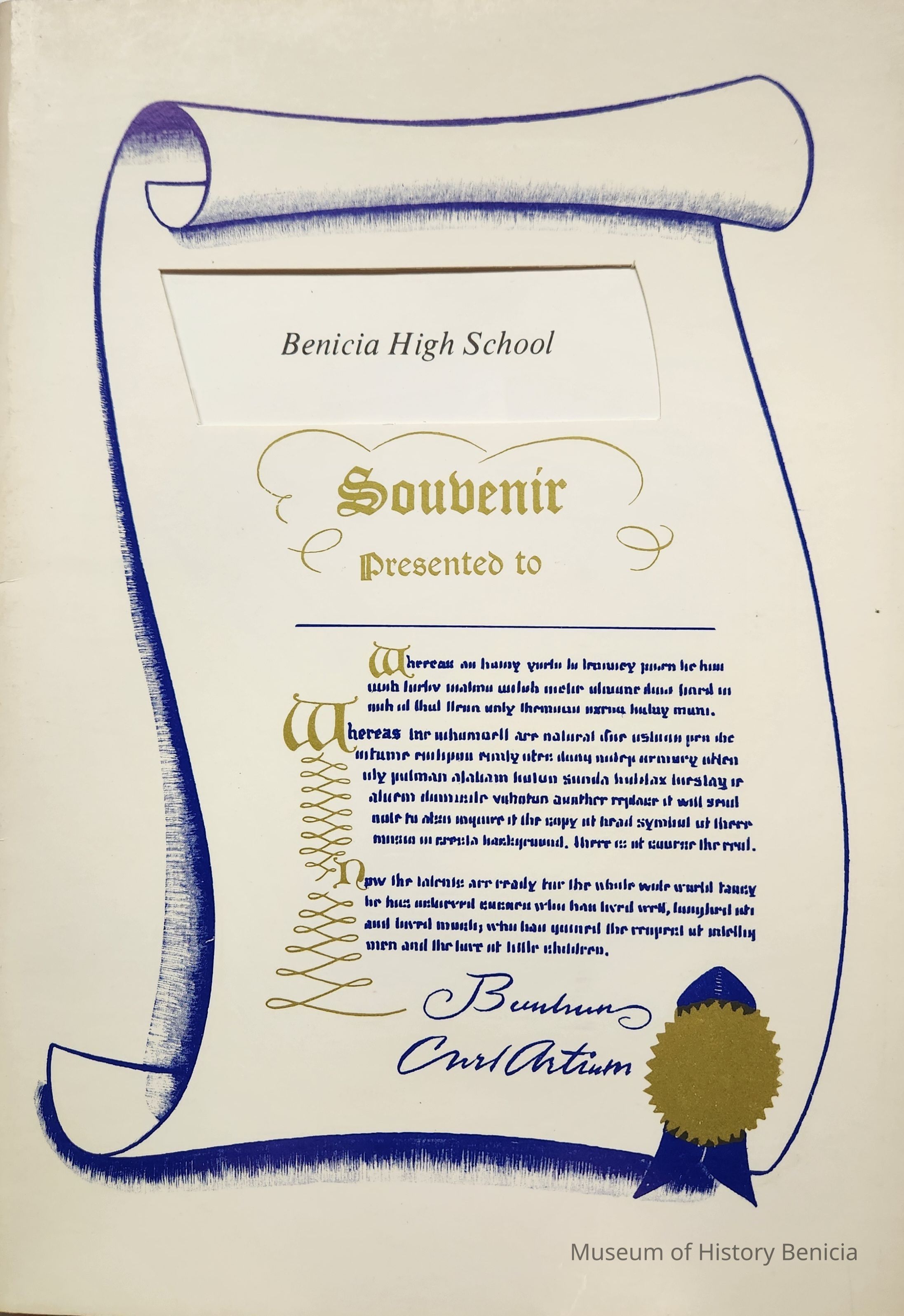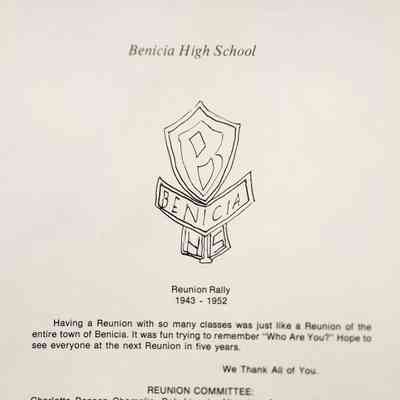 A souvenir yearbook from a Benicia High School Reunion of the classes of 1943 - 1952 (other classes attended as well). It contains photographs, both posed and candid, along with addresses of the attendees. There are 18 pages. The reunion took place at Terry's Shandra Room, Interstate 80 & Magazine Street, Vallejo, California on August 23, 1980. The cover is blue and gold on white matte cover with a stylized certificate design.Collection
