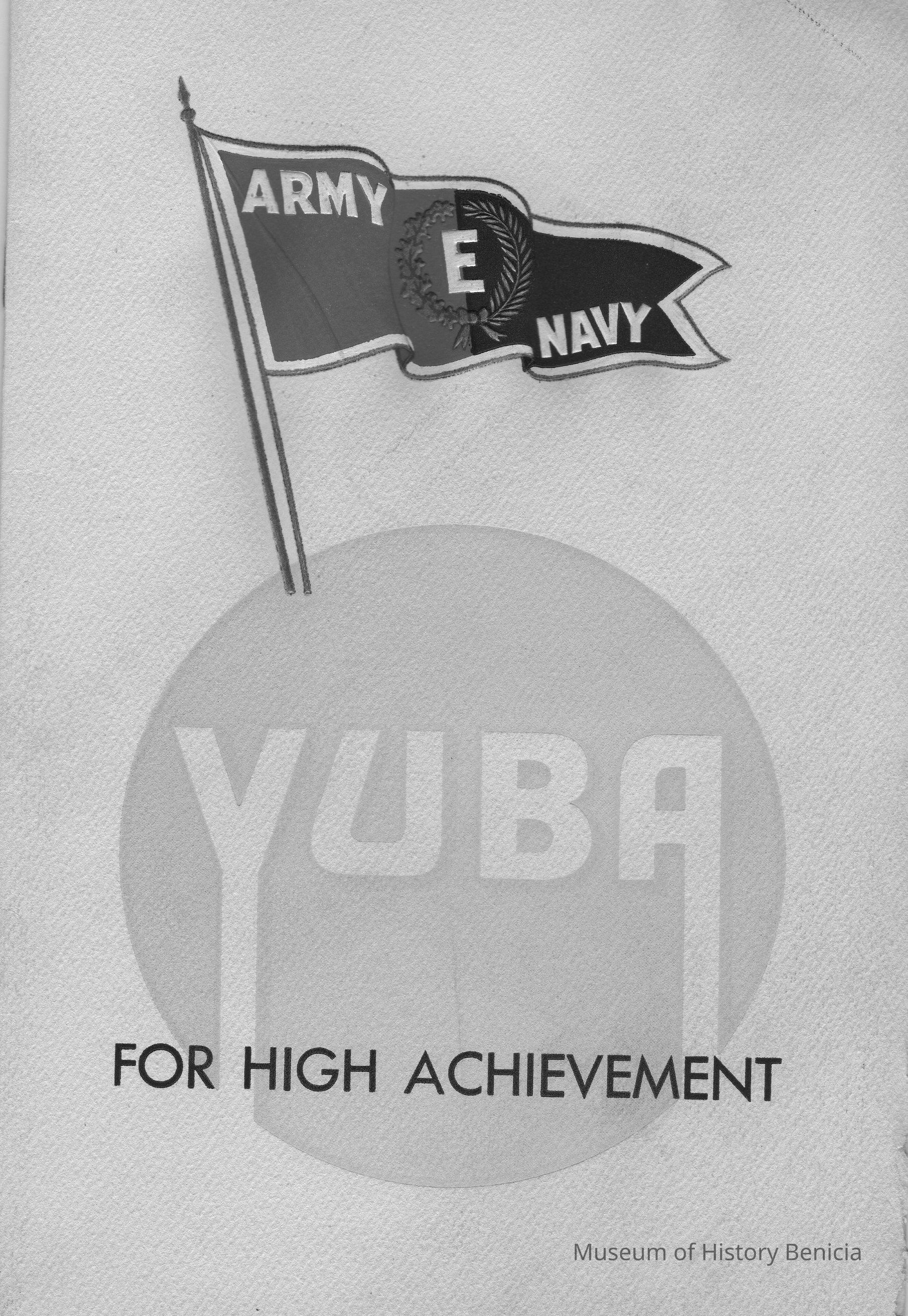 "Official Presentation Ceremony of the Army-Navy "E" Production Award/ March 30, 1944.../Yuba Manufacturing Co./Benicia, California." White paper with red and blue "E" pennant and "Yuba/??? High achievement" on front.Collection