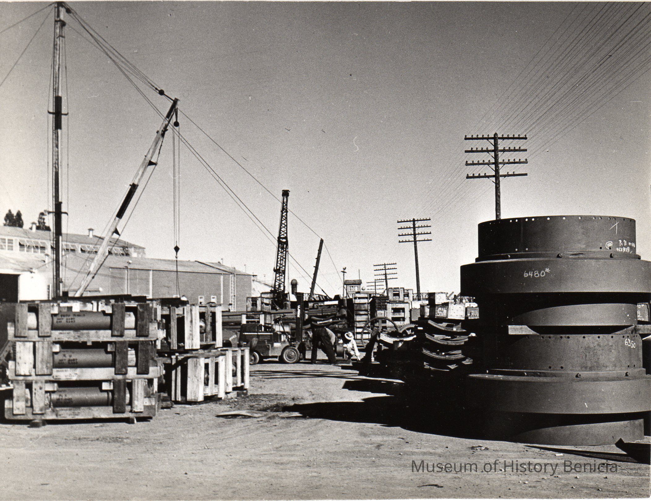 Bottom print: Outside storage and shipping area for finished products. B/W photo.