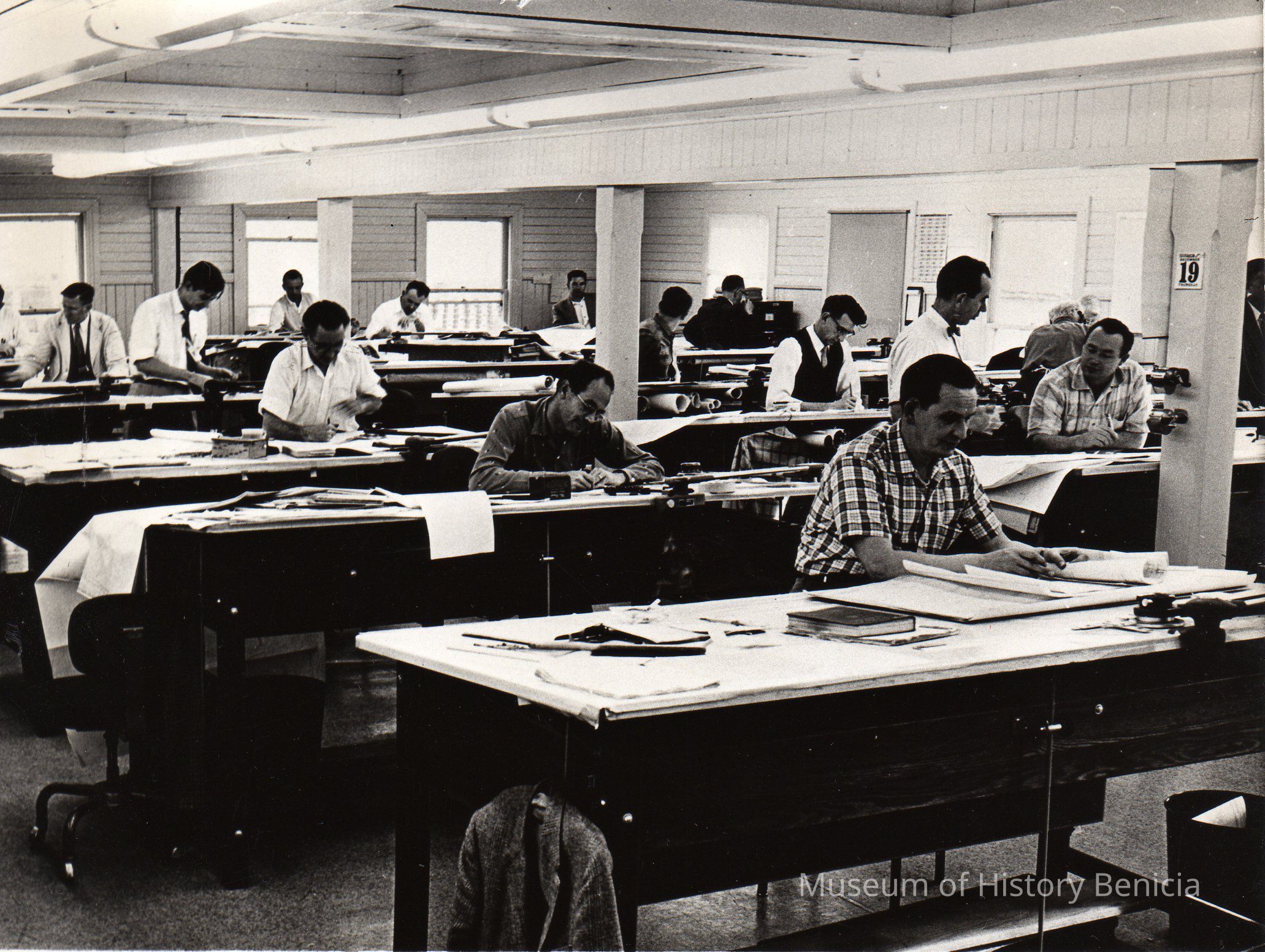 Top print: engineering office in old building, upstairs, circa 1950s. Black and white photo.