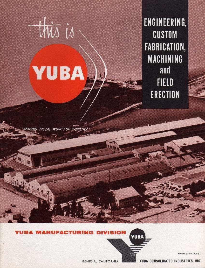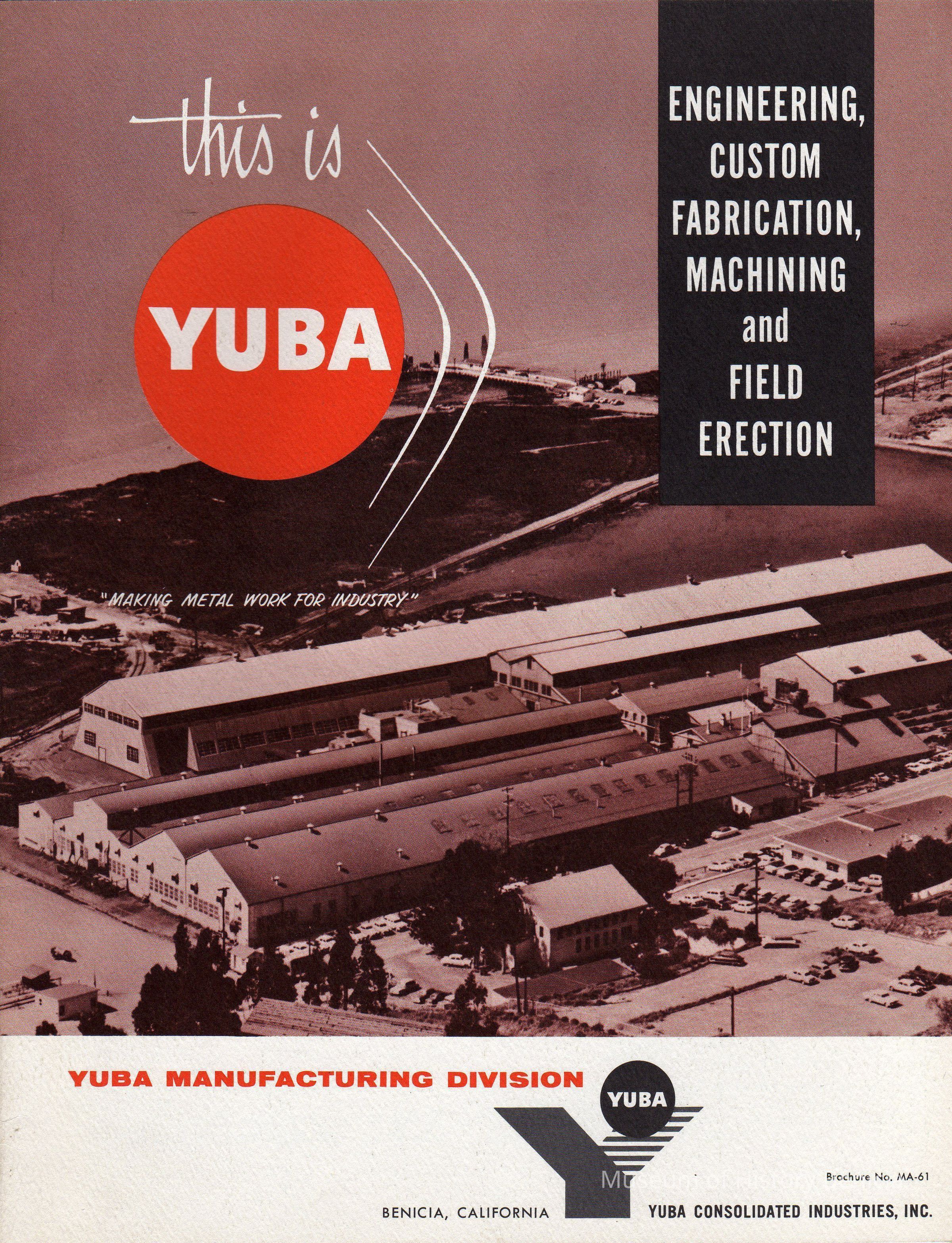 Informational book about Yuba Manufacturing. On the cover is a photograph of the Yuba Plant. Titled Yuba Manufacturing Division: Engineering, Custom Fabrication, Machining and Field Erection.Collection