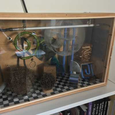 “I was called over to help clean out Kunio’s studio and was intrigued by his miniatures. I assume the textural maquettes were pieces he planned to build full scale one day. I also found the wooden box. Brought everything home and decided to build the piece as a postmortem ‘thank you’ to Kunio in the hopes his contribution will not be forgotten. Everything in the box was fabricated by Kunio excepting the floor, walls, and power supply, each of which I provided.”