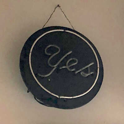 Wall sculpture mounted on plywood; animation spells out "Yes." Text: "Yes"