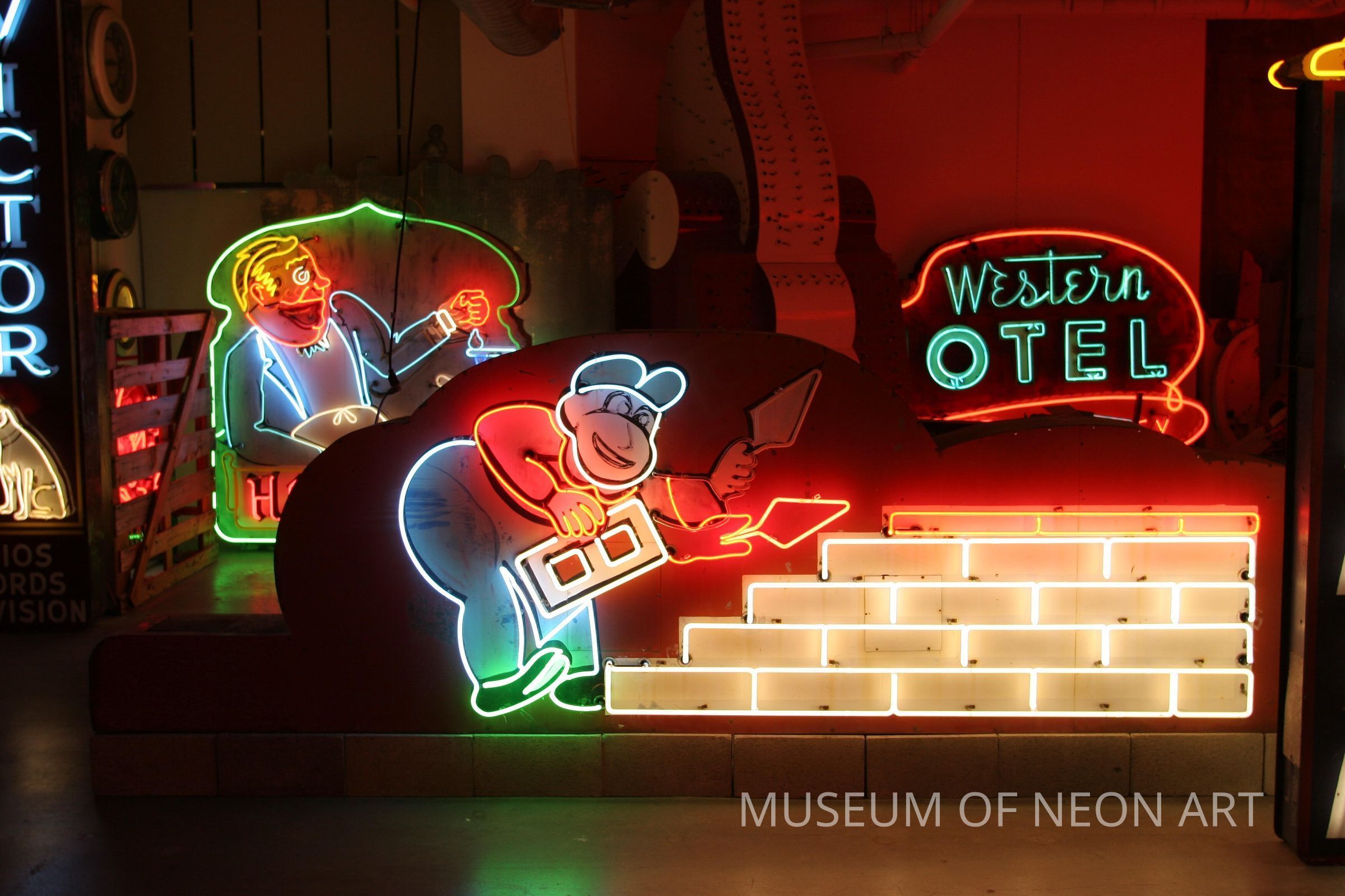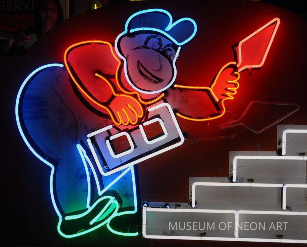 Originally part of a larger sign for Midway Building Materials, this animated bricklayer was donated to the Museum of Neon Art after 45 years of service as a neighborhood landmark. The design is rudimentary but makes the double-sided bricklayer sign all the more adorable.
