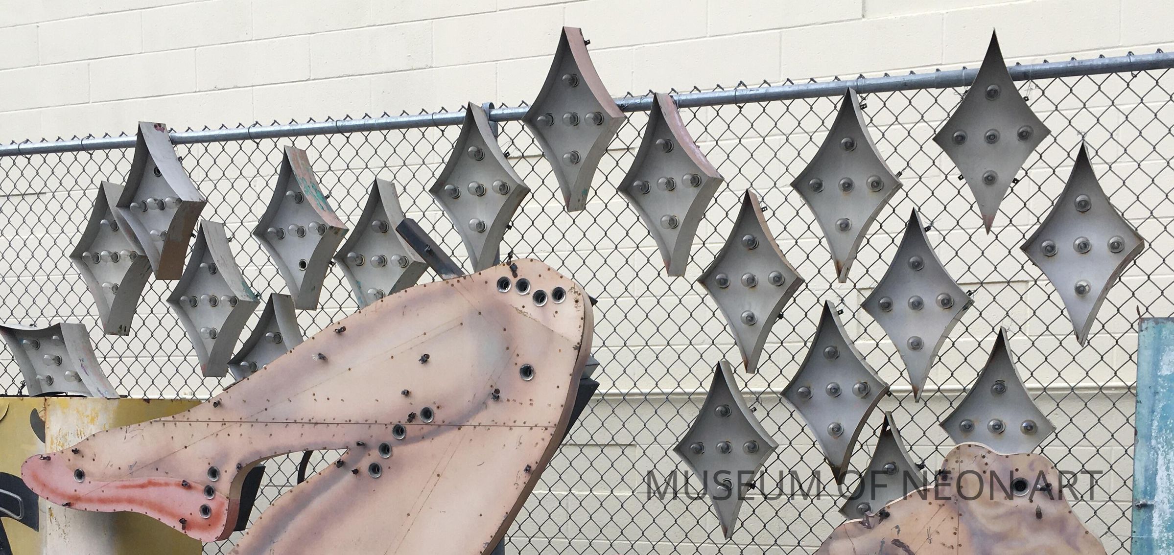 Small and large diamond-shaped bulb signs from the Movieland Wax Museum at 7711 Beach Blvd. in Buena Park, CA. Closed 2005; sign removed 2018.