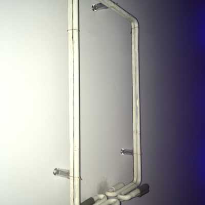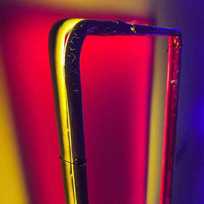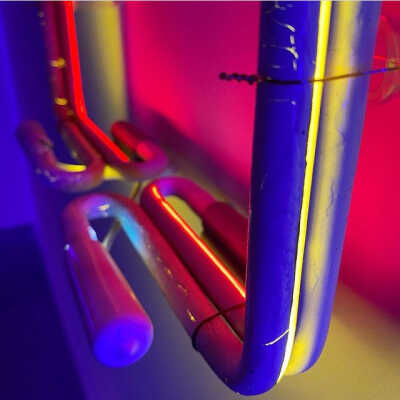 This piece consists of two neon rectangles with different phosphor coatings. The tubes are painted with blockout paint on the side facing the viewer. Blockout paint is a traditional tool of the trade used on neon signs to stop certain parts on a sign from being visible. The light from both tubes creates a backlight effect and a nuance of color, demonstrating additive color mixing and its possibilities through a minimal composition.