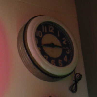 This is a 34" blue and yellow neon clock with a silver case. Built by the Neon Clock Company of New York City, New York, it was found in Savage, Maryland in 1984 by Jay Simmons. This clock is awaiting the restoration of the words "Time to Eat."