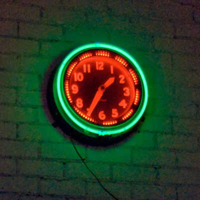This is a 25" orange and green neon rotor clock in a blue painted case. Found in downtown Los Angeles in 1978 by Jay Simmons and Steve Oliphant.