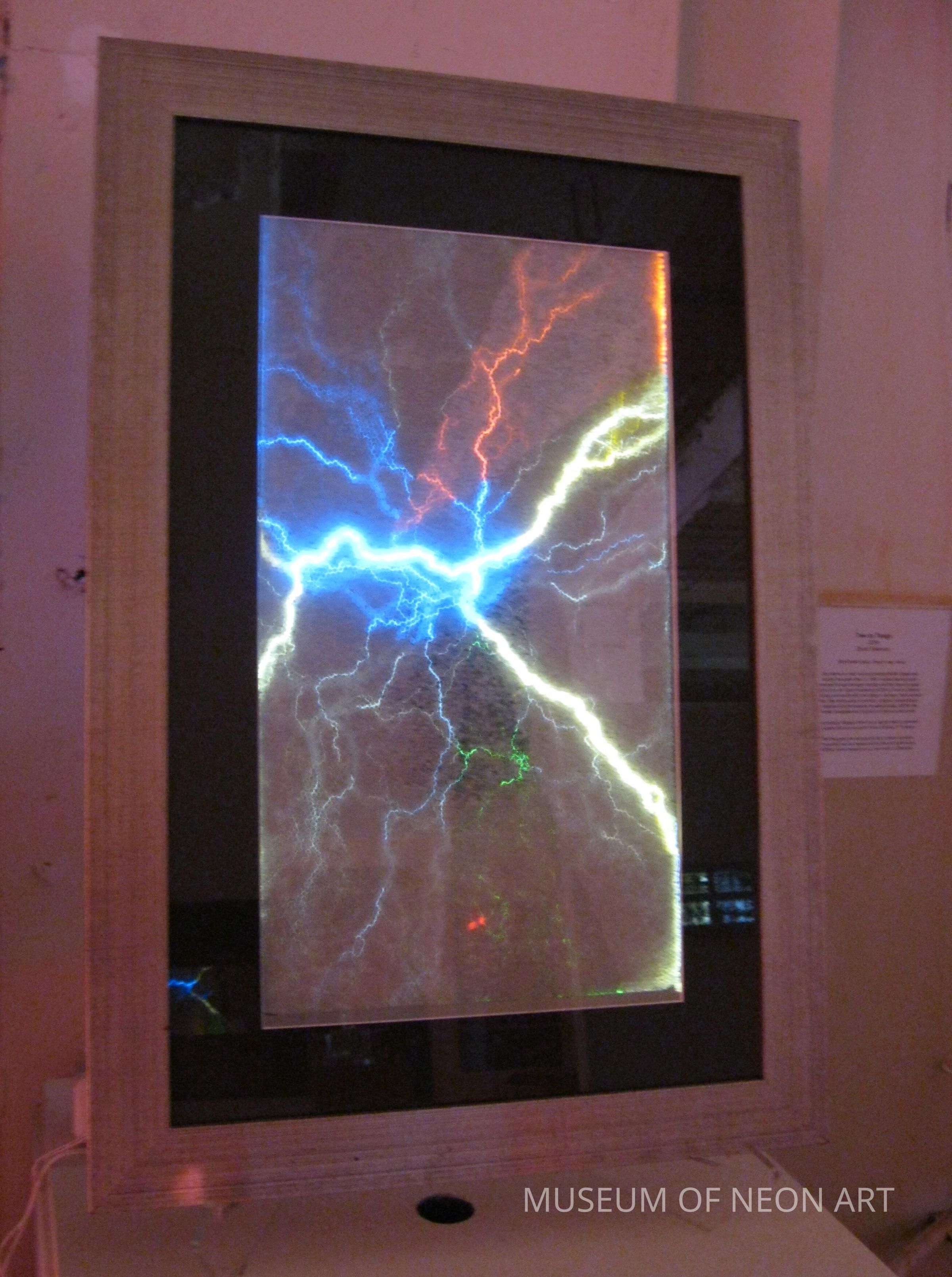 Speak to this artwork and it will listen and shine light back to you, mirroring the waves in the sound of your voice. This work consists of two glass panels bound together, which contain glass beads and argon gas. The glass beads are arranged in a dynamic pattern of a triangle and rectangles, but they are only visible when electricity flows around the beads. Since glass does not conduct electricity, the electricity navigates through the spaces between the glass.