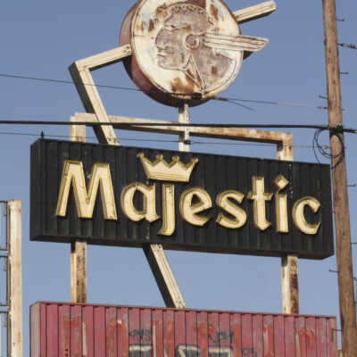 A piece of neon from Crenshaw Boulevard’s former Majestic Pontiac dealership survives in the shape of a noviol-gold crown. Atop the Majestic text, the illustrative feature once crowned the sign’s letter J. Majestic was part of a large complex which included the neighboring Holiday Bowl and Coffee Shop (housed currently in MONA’s warehouse). Preservationists attempted to save the historic Googie bowling alley from the wrecking ball, but lost. The framing for the property’s monumental signage was retained and repurposed for new businesses, but the lettering for the vintage tenants was removed, including this crown from Majestic Pontiac.
