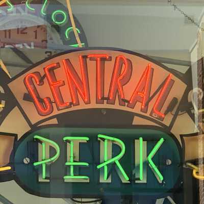 "Friends" was an American television sitcom, created by David Crane and Marta Kauffman, which aired on NBC from September 22, 1994 to May 6, 2004, lasting ten seasons. With an ensemble cast starring Jennifer Aniston, Courteney Cox, Lisa Kudrow, Matt LeBlanc, Matthew Perry, and David Schwimmer, the show revolved around six 20-30-something friends living in Manhattan. This sign is a replica created by Warner Brothers of the iconic logo on the window of the "Central Perk" coffeehouse, a location featured frequently in the series.