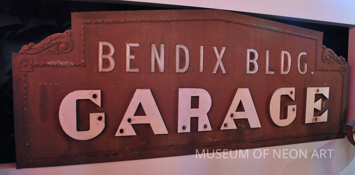 This Art Deco-era sign and its twin welcomed guests to park at downtown Los Angeles’ Bendix Building on 12th Street and Maple. The Museum of Neon Art worked with owner Steve Hirsh to replicate these gems with sturdier replacements. The two, original “Bendix Bldg. Garage” signs are now safe from the elements (and pigeons) at the Museum of Neon Art.