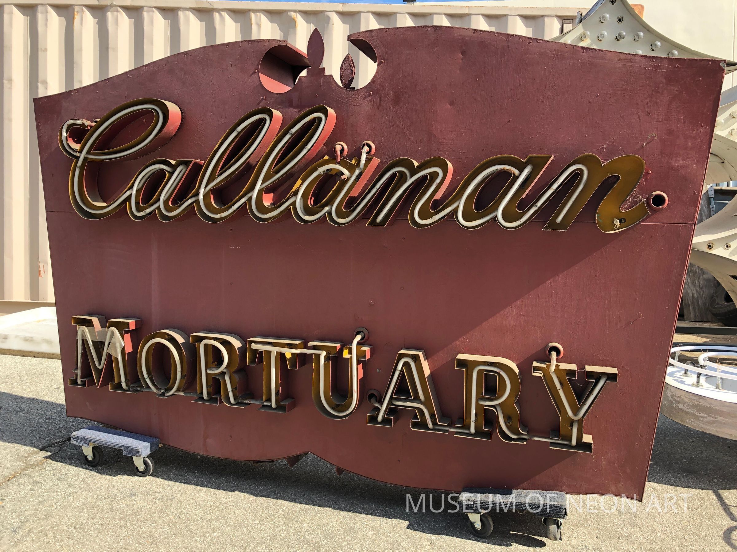 The Museum of Neon Art preserves and restores numerous types of neon signs. By far the most unusual is the category of mortuary neon. This particular model was designed in a comforting and noble Colonial style with deep channel lettering and stood on a Western Avenue corner on the eastern edge of Hollywood. Look closely between the neon words, and one may see the remains of a hand-painted “Hollywood” which was once part of the mortuary’s title.