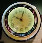 This is a 22" plastic-faced clock with rotating rainbow colors and color rotor patten. Made between 1979 and 1983, this clock has a black case and was copyrighted by Felix J. Simmons, Jr., all rights reserved.