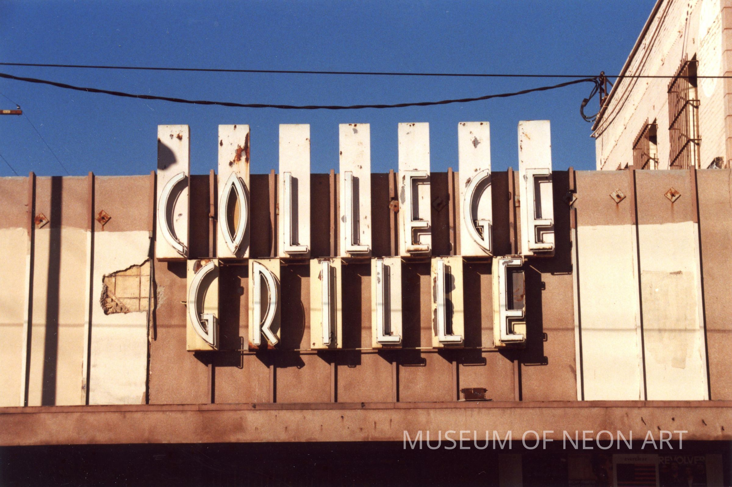 Fascinating neon typography marked the College Grille on Santa Monica Boulevard along Route 66 in Los Angeles. Located across the street from Los Angeles City College, the grill focused on quick orders for nearby students.