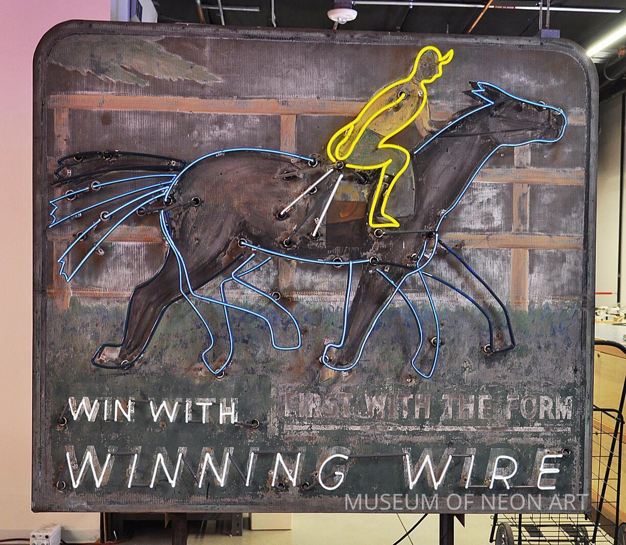 Winning Wire 1920s Donated by Aaron Russo, 1983 Little is known about the provenance of this sign. Prior to washing the hand-painted sign, its only text read “First with the Form” and “Win with Winning Wire.” However, after wetting the painted surface an old set of letters emerged beneath the new: “Racing Information.” The sign’s corrugated metal surface dates it to the 1920s and much of its paint seems to be original. Although no photos existed at the time to assist the Museum of Neon Art in the sign’s refurbishment, it was determined by the placement of the electrode housings that the horse was animated to run and the jockey’s right arm to whip. With a grant from the National Endowment for the Arts, the museum relit the sign with dim Krypton gas so the illumination will not overpower the subtleness of the “primitive” painting style. A similar sign was later discovered in an old photo of downtown Los Angeles, above Sam Smith’s News Stand at the corner of Fifth and Main Streets.