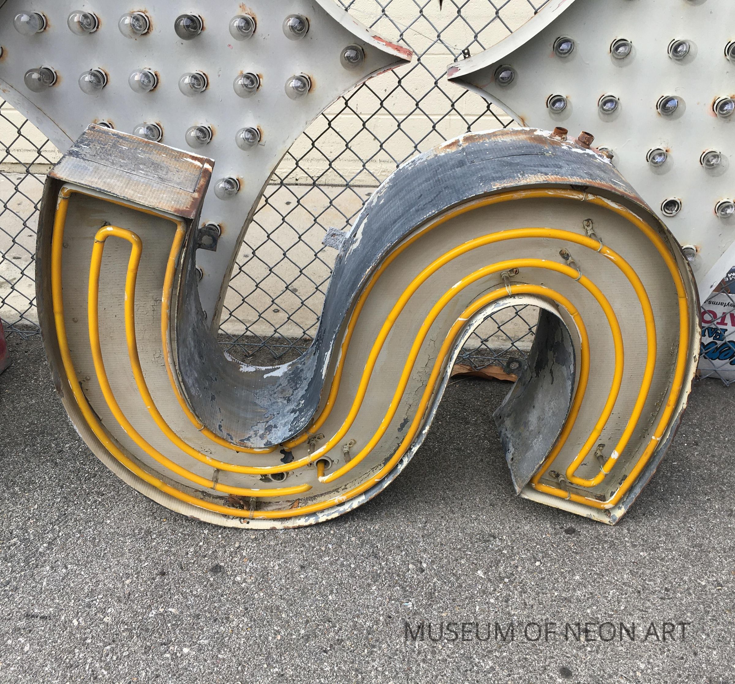 Desmond's was a Los Angeles-based department store founded by Daniel Desmond in 1862 near the Los Angeles Plaza. Its haberdashery focused on men’s apparel, ready-to-wear and bespoke, with stores across Southern California. The sans-serif channel letters with noviol gold tubes came from the store’s downtown warehouse location.