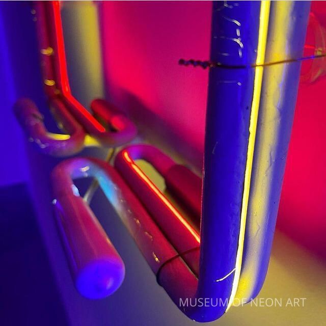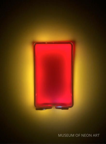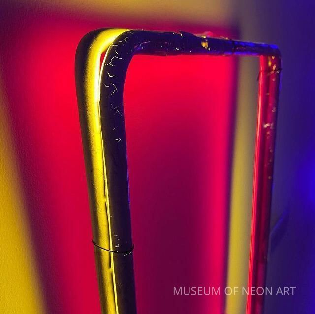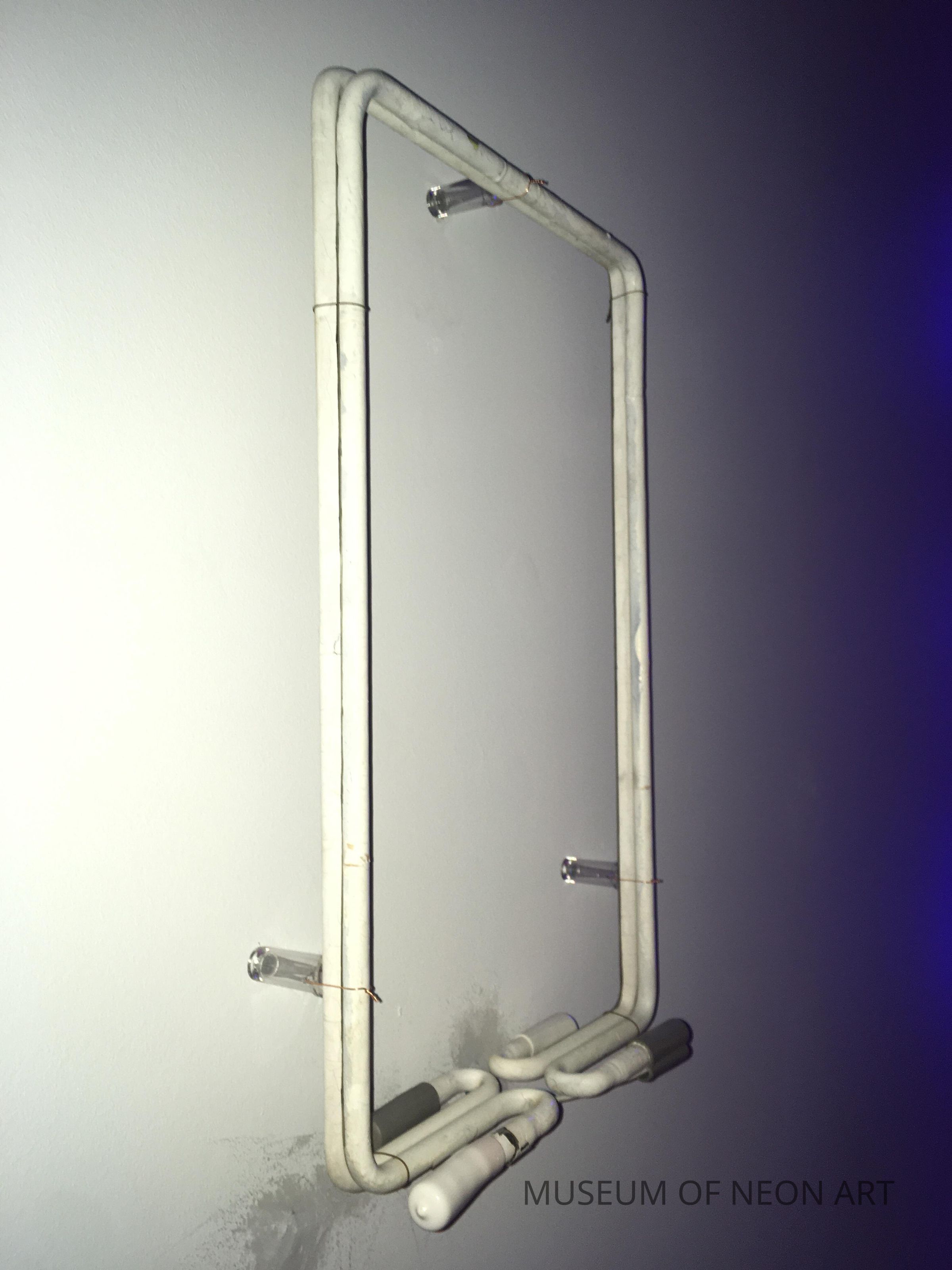 This piece consists of two neon rectangles with different phosphor coatings. The tubes are painted with blockout paint on the side facing the viewer. Blockout paint is a traditional tool of the trade used on neon signs to stop certain parts on a sign from being visible. The light from both tubes creates a backlight effect and a nuance of color, demonstrating additive color mixing and its possibilities through a minimal composition.