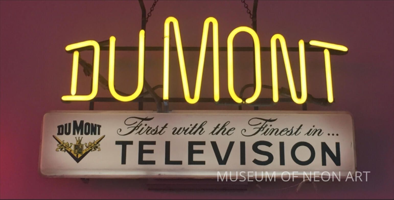 This backlit plastic and neon window sign advertised DuMont Television, a pioneering broadcast network which began as an extension of Allen B. DuMont Laboratories. The Lab, which was founded in 1931 created the first consumer all-electronic television receiver, successfully extended the life of a cathode-ray tube in order to make consumer-ready TV sets, and developed radar technology during World War II.