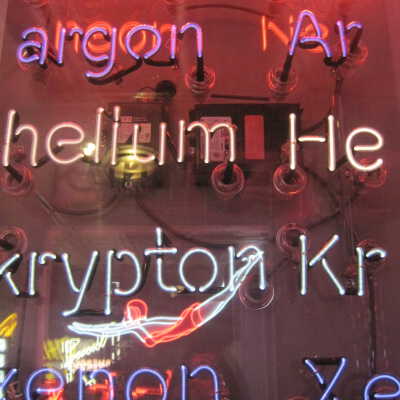 In this educational display, each word is pumped with its corresponding gas. The tubes themselves are clear, meaning that we can see the pure color of each electrified element. Neon glows bright red, Argon shines a pale lavender, Helium makes a peachy white, Krypton shines silvery white, and Xenon glows blue or bright white. Neon artists can create a myriad of colors like bright green and yellow through using colored glass or phosphor-coated glass.