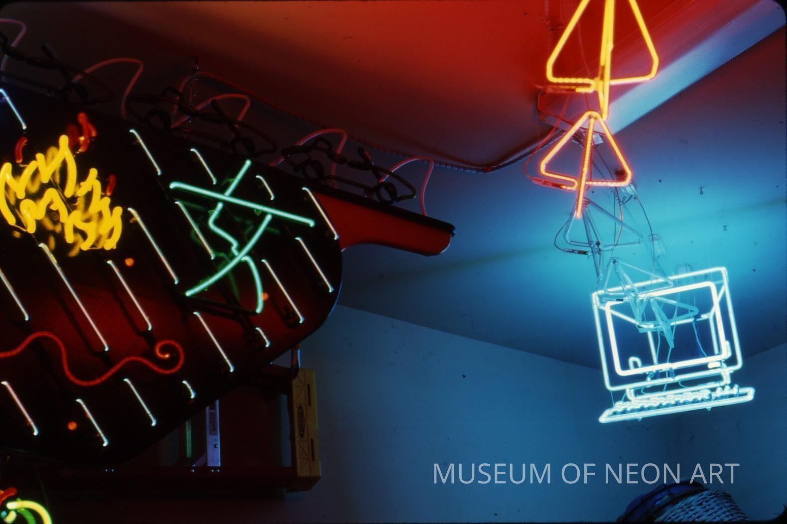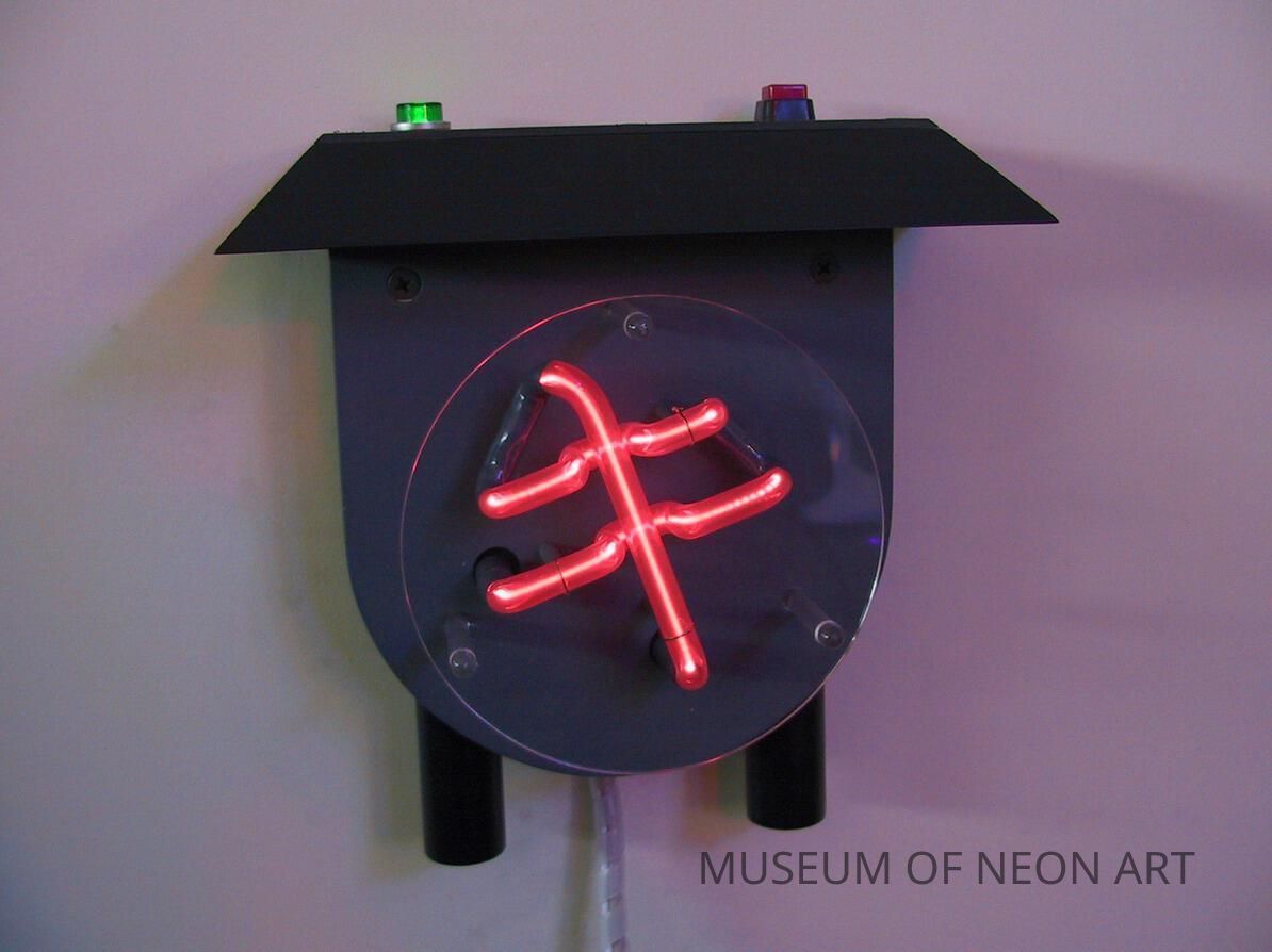 "This was a commissioned work for someone who had run out of room for art in her house. The symbols were agreed upon by the client and myself to relate to various aspects of her life. The Oracle is activated whenever the client opens her garage door. There is a micro computer that controls whether the paper airplanes are going to fly out of the computer and whether the shark fin or the Jaguar convertible is going to move across the top of the work. Also there are flashing indicator lights next to each of the symbols that, depending whether or not they stay lit, what the client can expect from her day. God's watchful eye and the cows spinning around the tornado are always in constant motion."