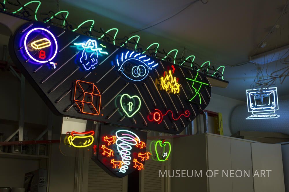 Animated artwork featuring 3D computer and paper airplanes, plus various symbols: fire, eye, iceberg, locked heart, tornado, hot dog, apple, etc. Commissioned piece for client's home, activated by garage door opener.Collection
