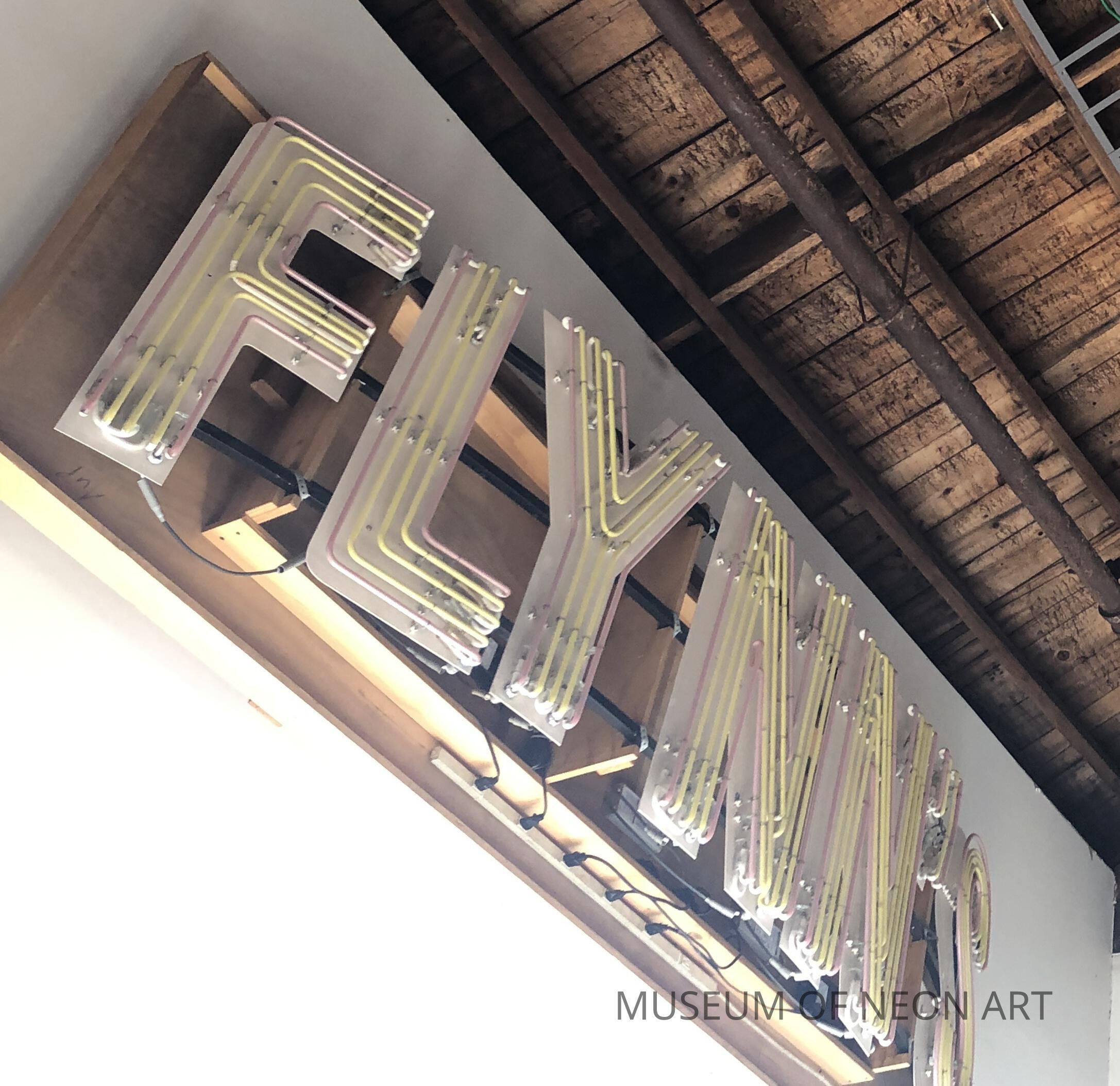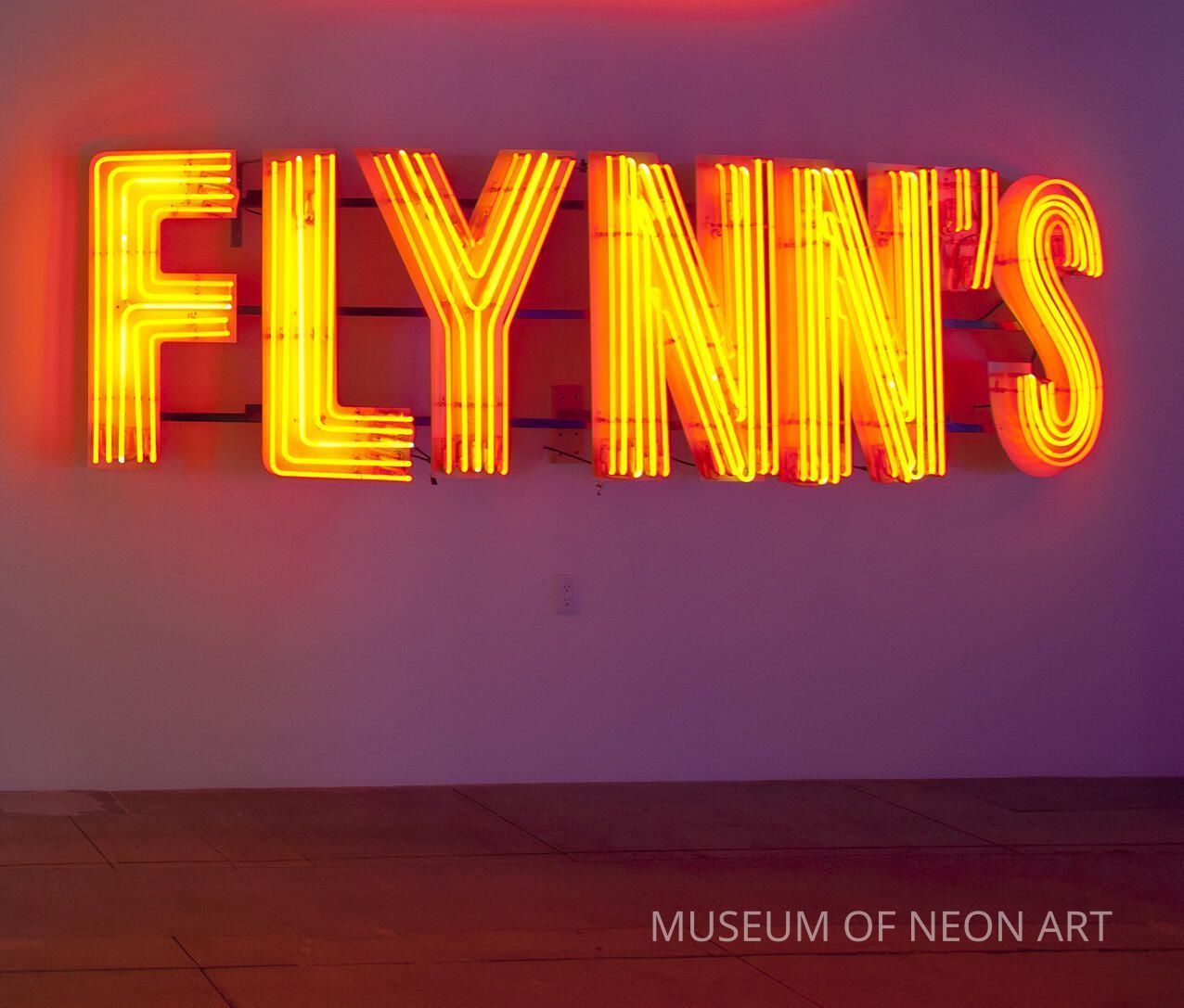 Replica of the Flynn's Arcade sign from the 1982 film "Tron." The sign was made by Disney to promote the 2010 "Tron" film reboot at Comic-Con in San Diego, and later displayed at Disney's California Adventure theme park. Also in MONA's collection is skeletal neon arcade game iconography created by Disney to be displayed along with the Flynn's sign. Text: "FLYNN'S"
