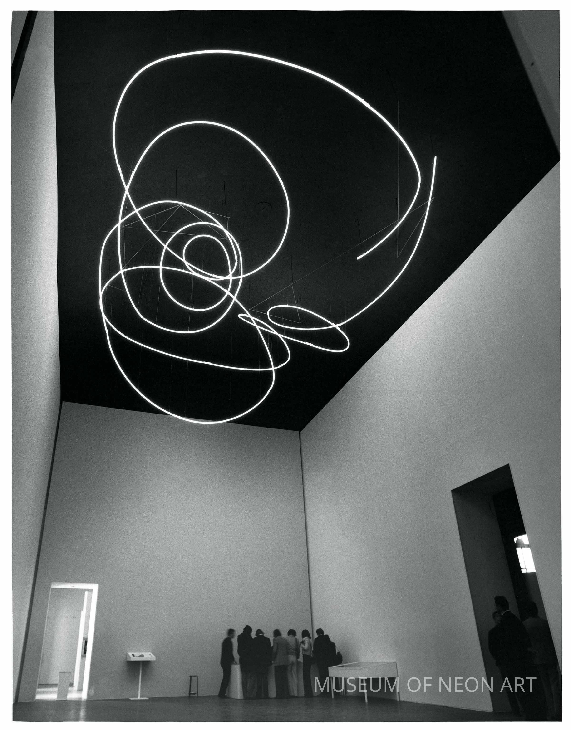 Ugh Mulas' photograph of Lucio Fontana's neon piece "Ambiente with Luce Spaziale" (100 meters of 18mm tubing, destroyed) from the 1951 IX Triennale di Milano.Interpretative Labels