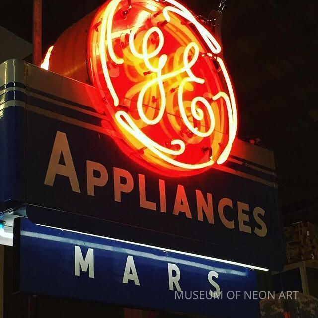 The classic General Electric logo glows in a coral color against a navy, orange, gray, and white porcelain-enamel background. Underlighting in white neon was intended to light a sidewalk or window display.