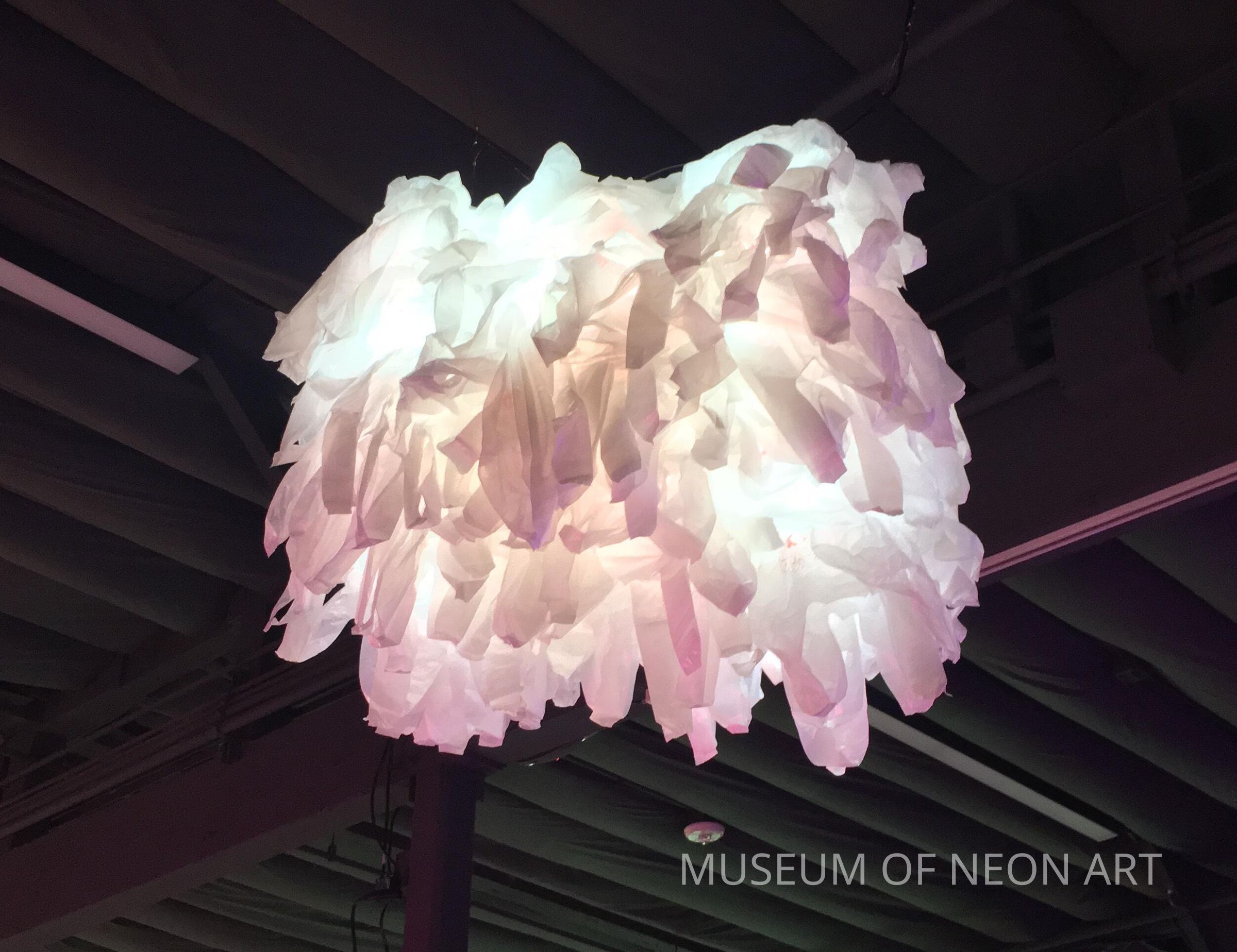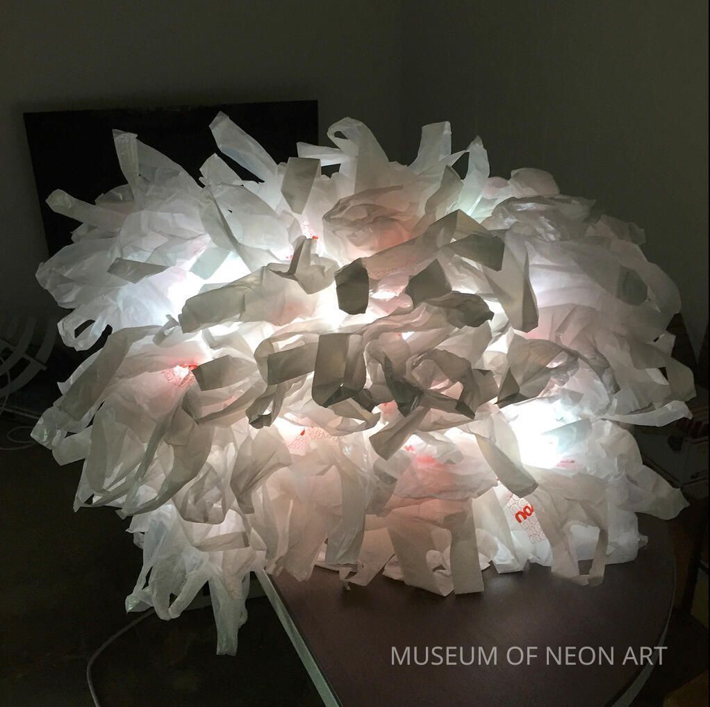 This hanging lamp transforms an accumulation of ordinary ”thank you” take-out bags into an organic form. Bill Concannon is known for his experimental use of neon and plastic, from creating very small neon signs and works, to large mixed media sculptures. When neon tubes are electrified, they are not hot to the touch like lightbulbs, which enables Concannon to string plastic around neon tubing without melting the plastic.