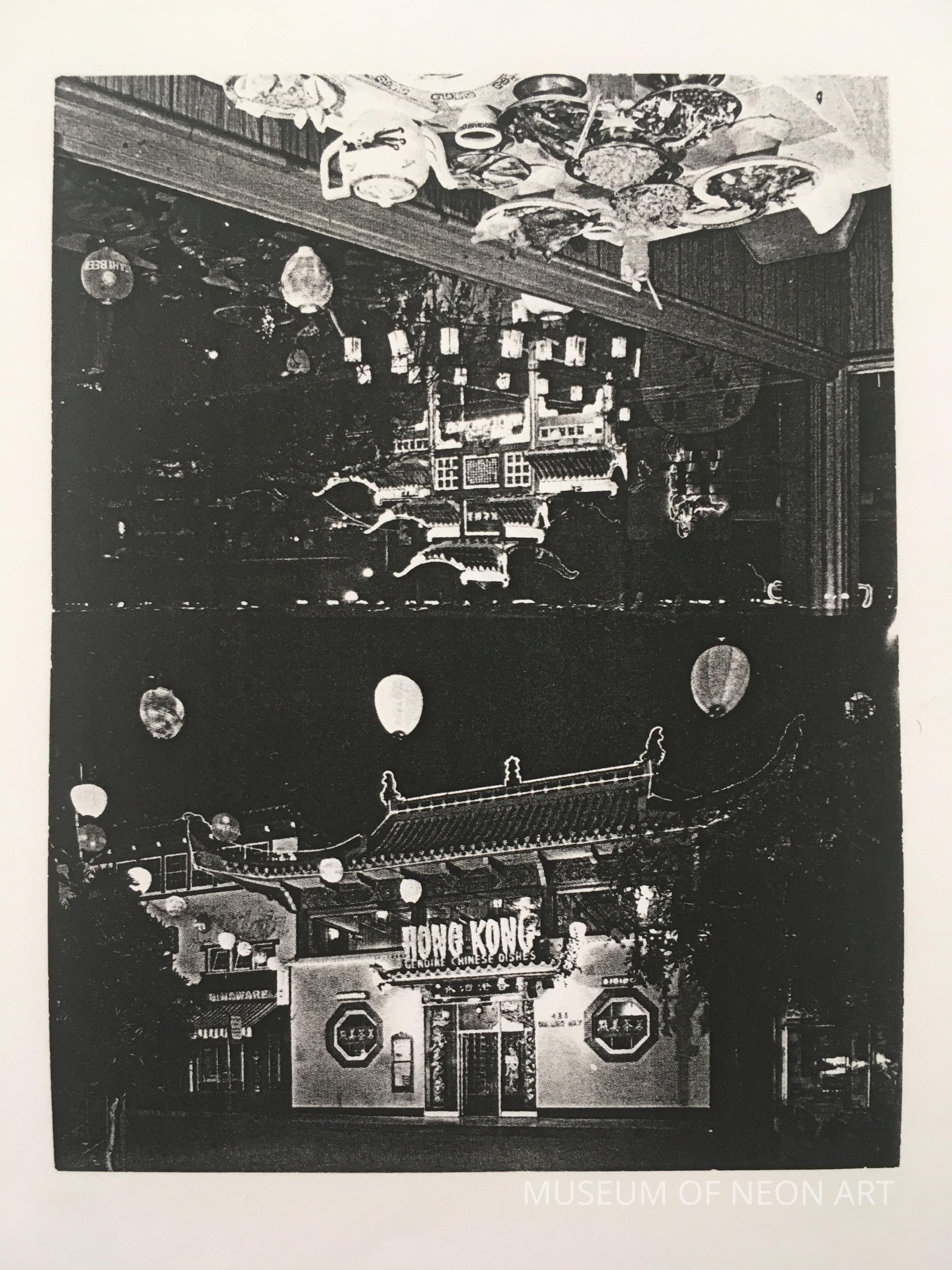 Vintage foldover business card from the Hong Kong Low Restaurant in Chinatown, downtown Los Angeles, featuring photos of neon.