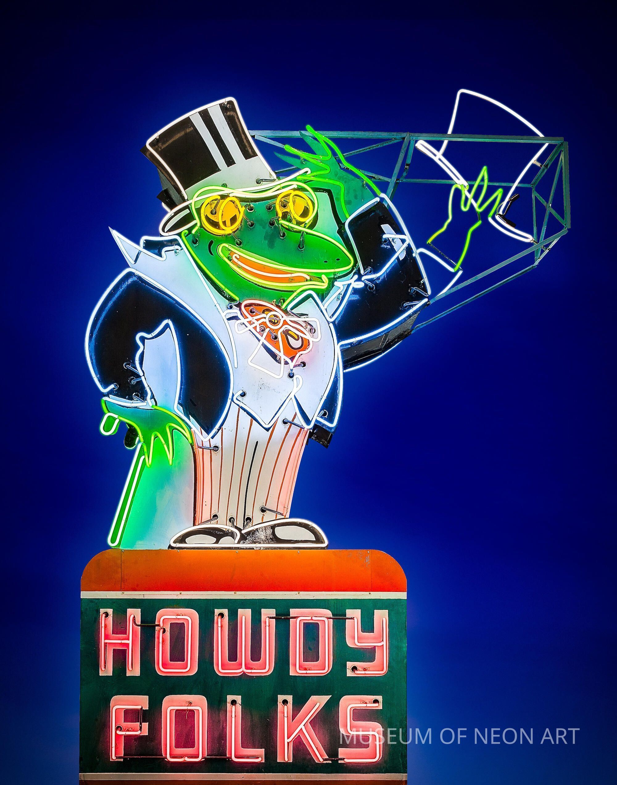 The first Green Frog Market in Bakersfield, CA opened in 1934 after being granted permission to use the name from a Stockton grocery store chain that began in 1930. In 1946, a second Bakersfield store was added. By 1948, the Stockton chain had four locations, at which time the owner sold the stores to build new Green Frog Markets in the San Francisco Bay Area, Oakland and San Jose. Years later, in 1988, a third Bakersfield location opened. Originally from one of the Stockton stores, this sign was installed at the second Bakersfield location to replace a sign with a sitting frog logo when they remodeled and expanded in 1952. In 2009, the owner relocated the sign to an enclosure to protect it from vandalism. In 2013, the famous frog sign was donated to MONA by the Scott Hair Family after the Green Frog Market's last Bakersfield location (store #2) closed.