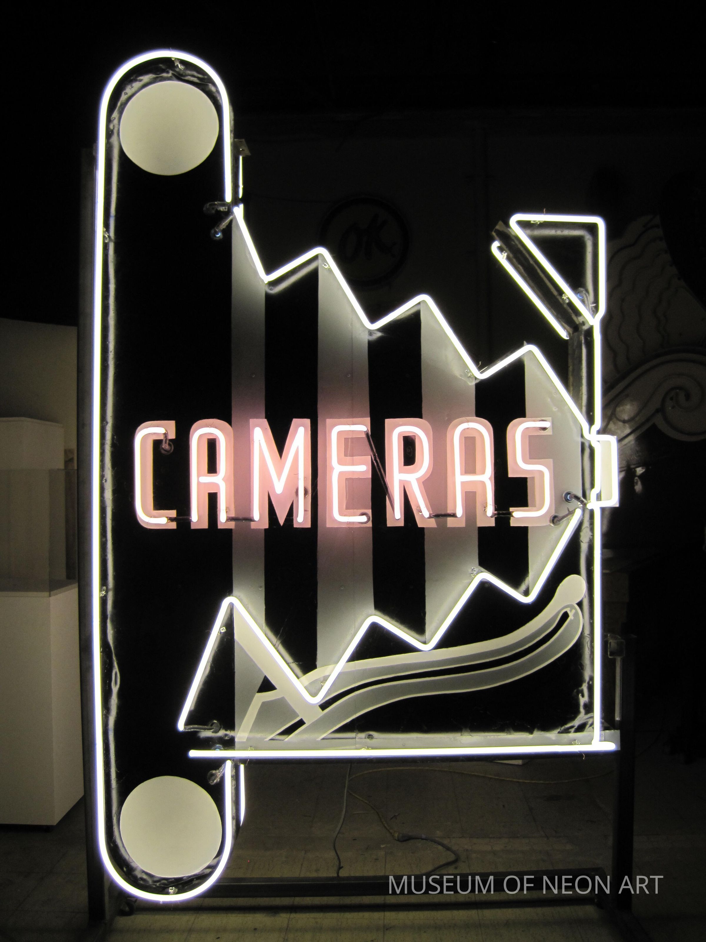 From the historic Little Tokyo neighborhood in downtown Los Angeles, this massive double-sided camera sign has been restored with a grant from the National Endowment for the Arts. One side of this hand-painted sign was restored with new paint and the other side left as-is. Note the two tones of white-colored neon used to delineate the sign.
