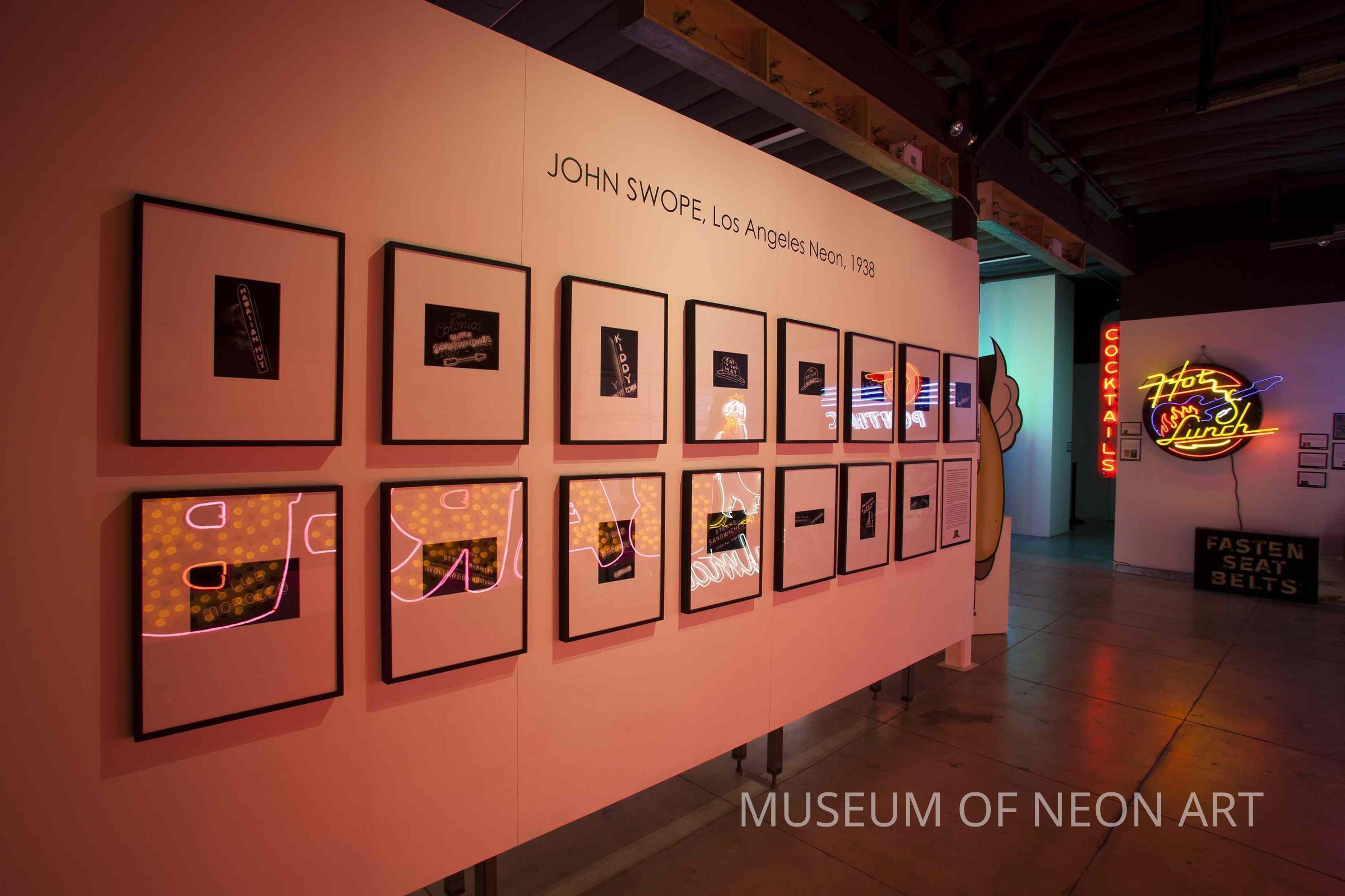 JOHN SWOPE was born in New Brunswick, New Jersey, in 1908. After graduating from Harvard in 1930, he became involved in the University Players on Cape Cod, where he became close friends with actors Henry Fonda and James Stewart and director Josh Logan. After running a New Deal program, Swope signed on to a Los Angeles-to-Hawaii yacht race in 1936 where he developed an interest in photography. Settling in Los Angeles, he started taking pictures of Fonda and Stewart and worked as an assistant to uber-agent Leland Hayward. Using all these contacts, Swope produced a behind-the-scenes view of the Hollywood Studio system at its apex called Camera Over Hollywood (1939). He began shooting for Better Homes and Gardens and eventually Life magazine. During World War II, he took the photos for a book written by John Steinbeck on the training of Army Air Force flight crews called Bombs Away. He eventually became a member of Edward Steichen’s Navy photo unit and covered the freeing of Americans from Japanese prisoner-of-war camps. Swope’s early residence in Los Angeles coincided with his efforts to teach himself photography. He took photos of everything he found interesting in his new home, including lots of neon signage.