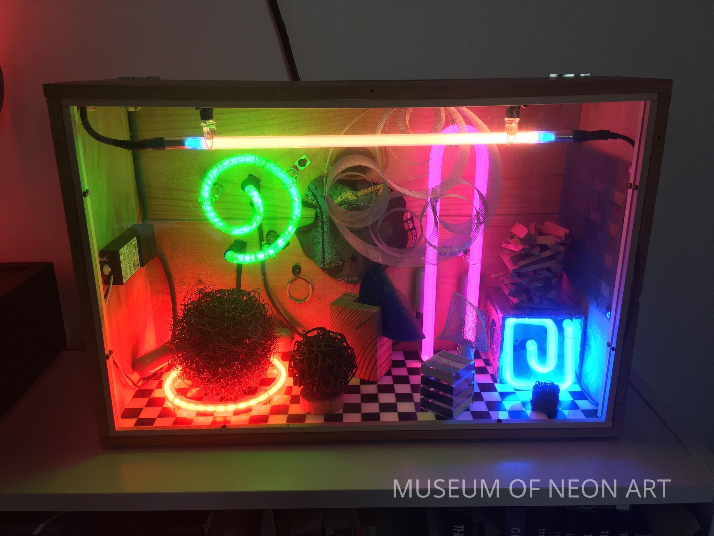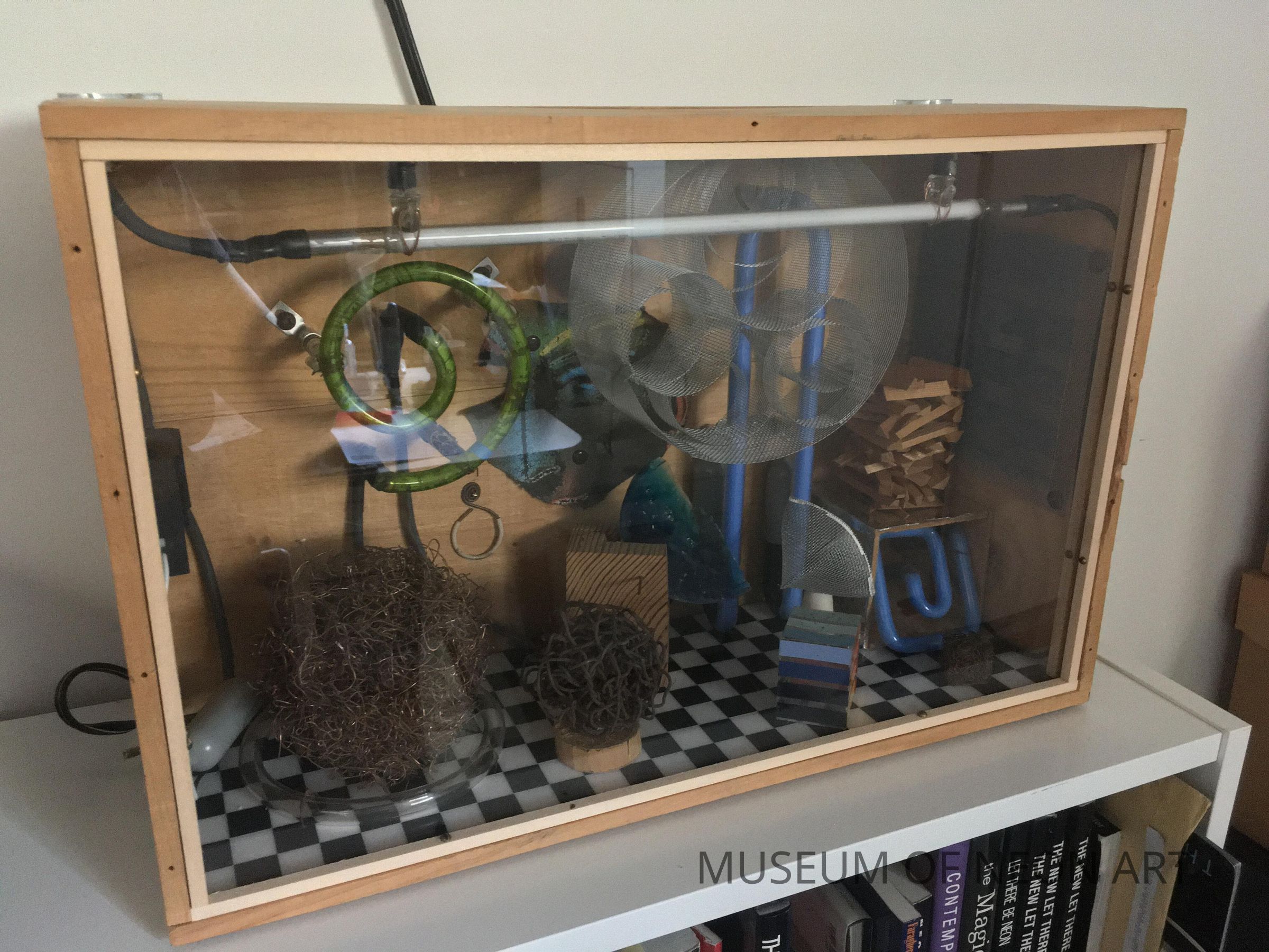 “I was called over to help clean out Kunio’s studio and was intrigued by his miniatures. I assume the textural maquettes were pieces he planned to build full scale one day. I also found the wooden box. Brought everything home and decided to build the piece as a postmortem ‘thank you’ to Kunio in the hopes his contribution will not be forgotten. Everything in the box was fabricated by Kunio excepting the floor, walls, and power supply, each of which I provided.”