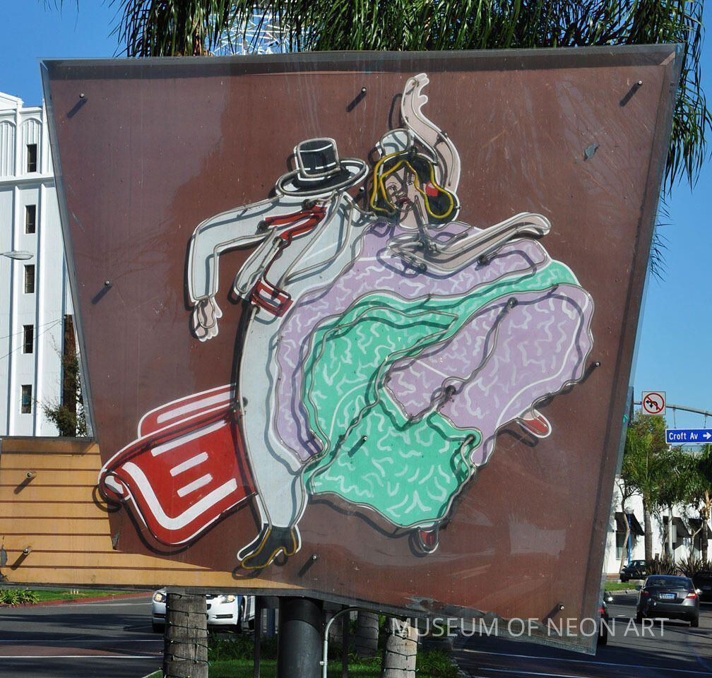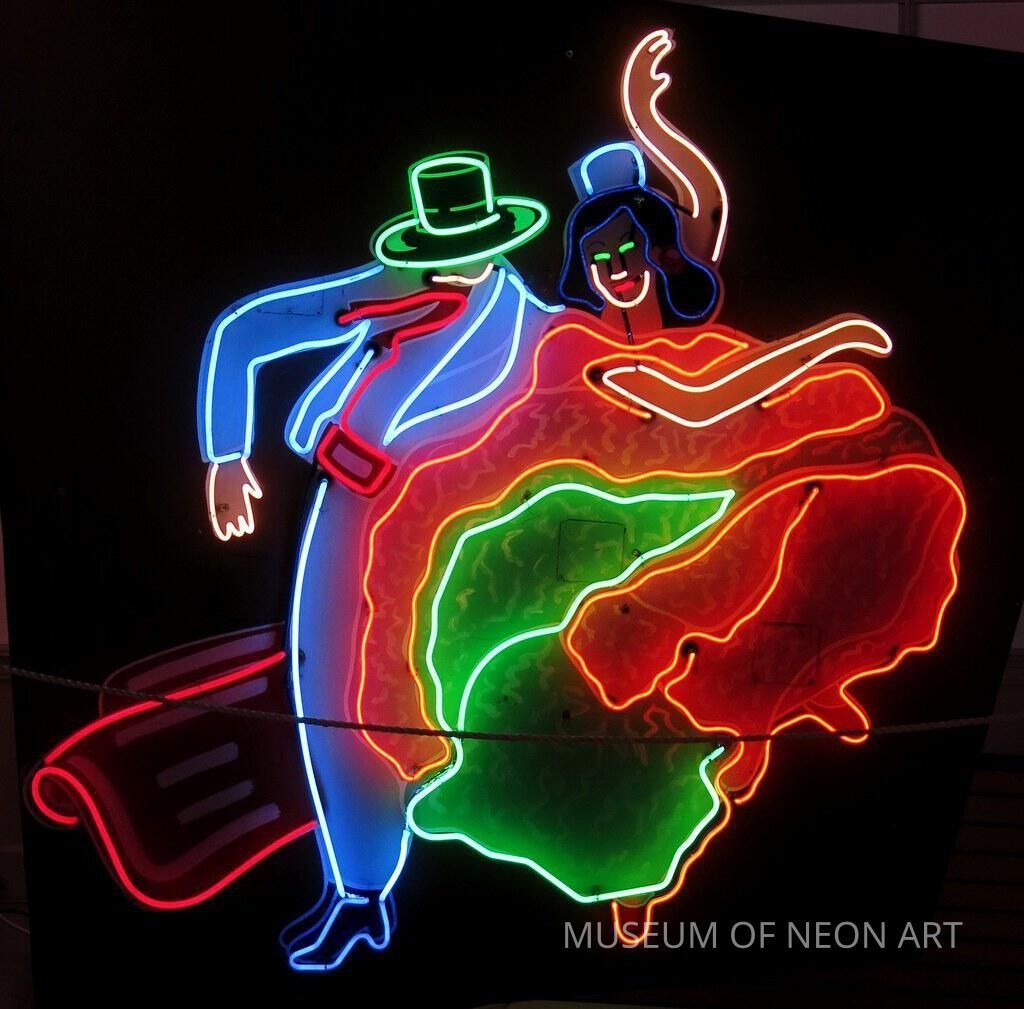 This neon couple danced above La Fonda Mexican Food for 38 years before the city of Glendale passed a sign ordinance calling for the removal of hundreds of neon signs in 1982. Rather than see his family’s history gone forever, Ricardo Romero donated the sign his parents had commissioned to the Museum of Neon Art. From 1993 to 2000, the sign graced the central plaza of CityWalk with other historic signs from MONA’s collection. When the sign was removed from CityWalk, Swain Sign Company in Ontario, CA stored it until it was returned to MONA. This double faced sign is in perfect condition on one side, but maintains its original patina on the other side.