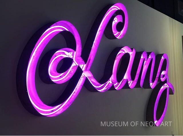 The Miracle Mile was a shopper’s paradise and home to Wilshire Boulevard’s Lanz dress shop. A seemingly simple cursive sign is made all the more complicated by a double-looping "L" and dual-tube illumination. Originally protected by a plastic face, the museum has chosen to reveal the sign’s internal twists and turns.