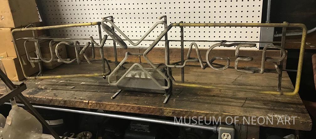 Neon beer sign. Text: "LUCKY / X / LAGER"