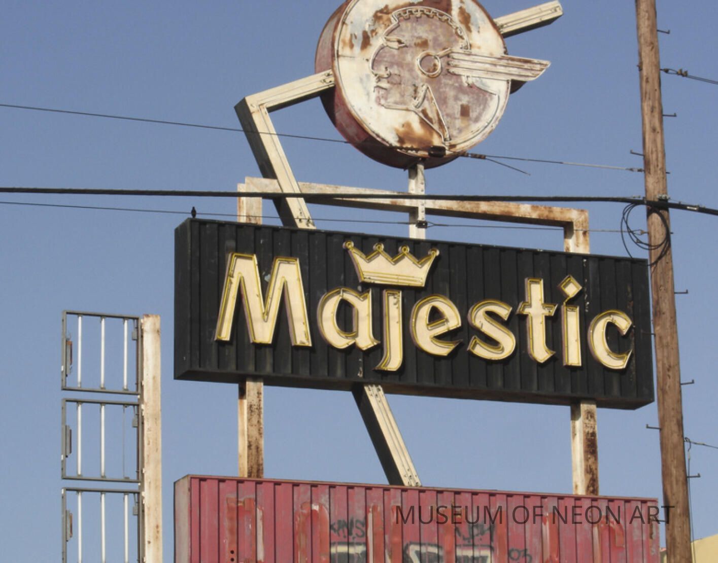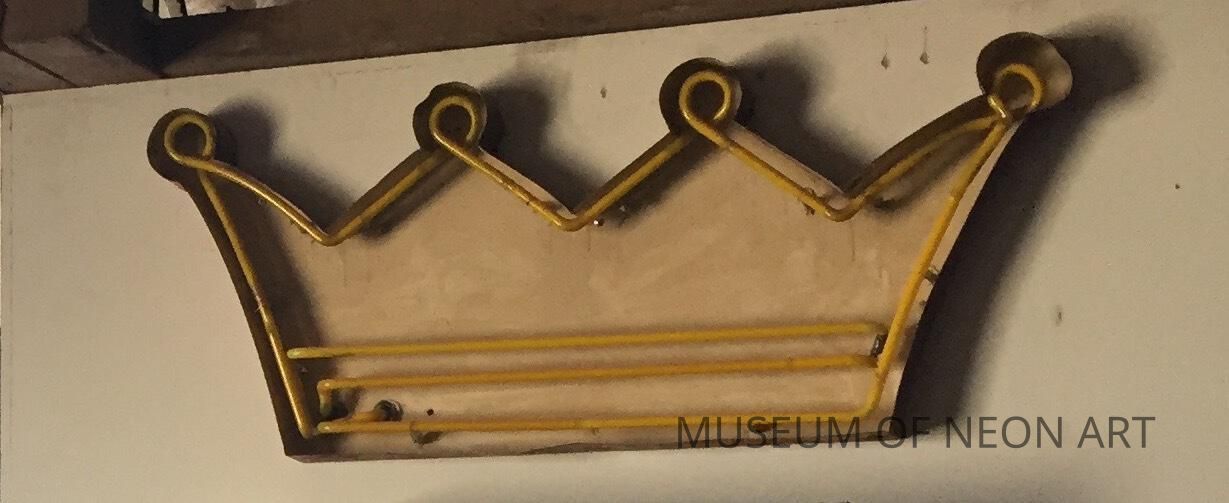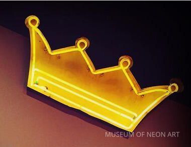 A piece of neon from Crenshaw Boulevard’s former Majestic Pontiac dealership survives in the shape of a noviol-gold crown. Atop the Majestic text, the illustrative feature once crowned the sign’s letter J. Majestic was part of a large complex which included the neighboring Holiday Bowl and Coffee Shop (housed currently in MONA’s warehouse). Preservationists attempted to save the historic Googie bowling alley from the wrecking ball, but lost. The framing for the property’s monumental signage was retained and repurposed for new businesses, but the lettering for the vintage tenants was removed, including this crown from Majestic Pontiac.