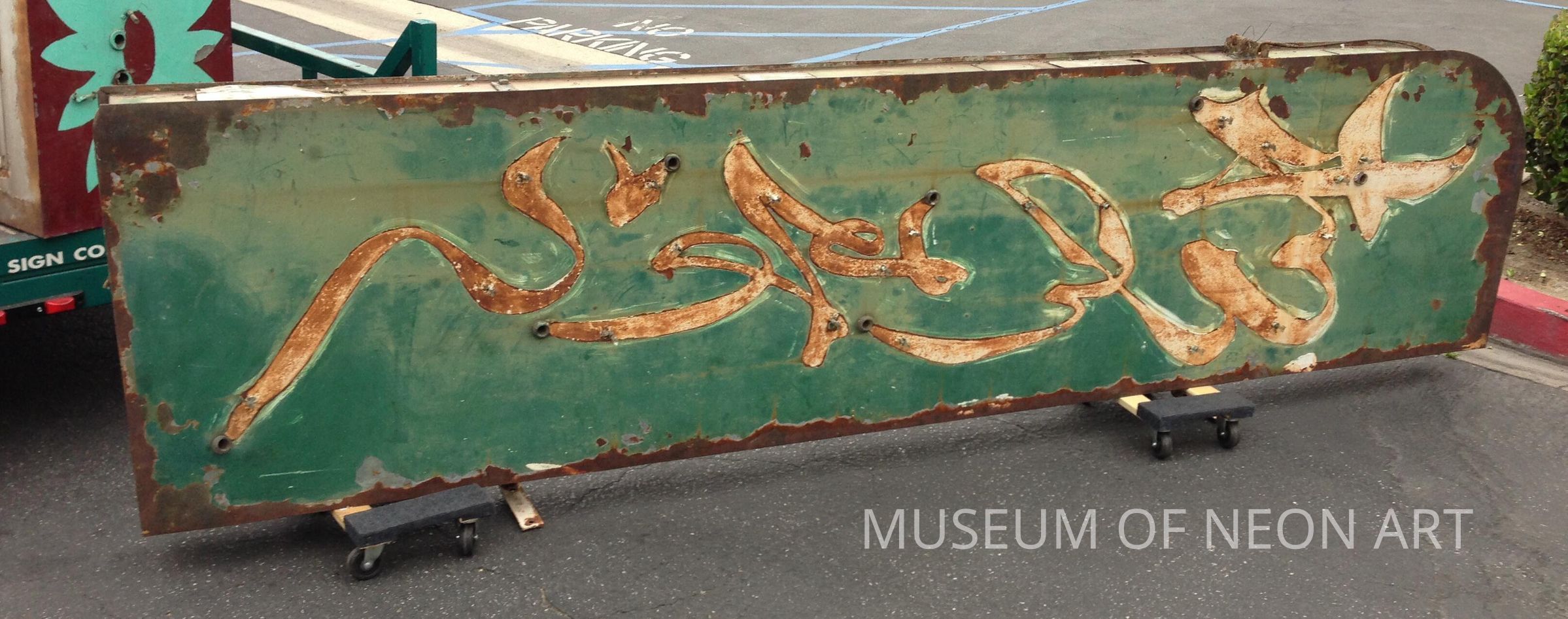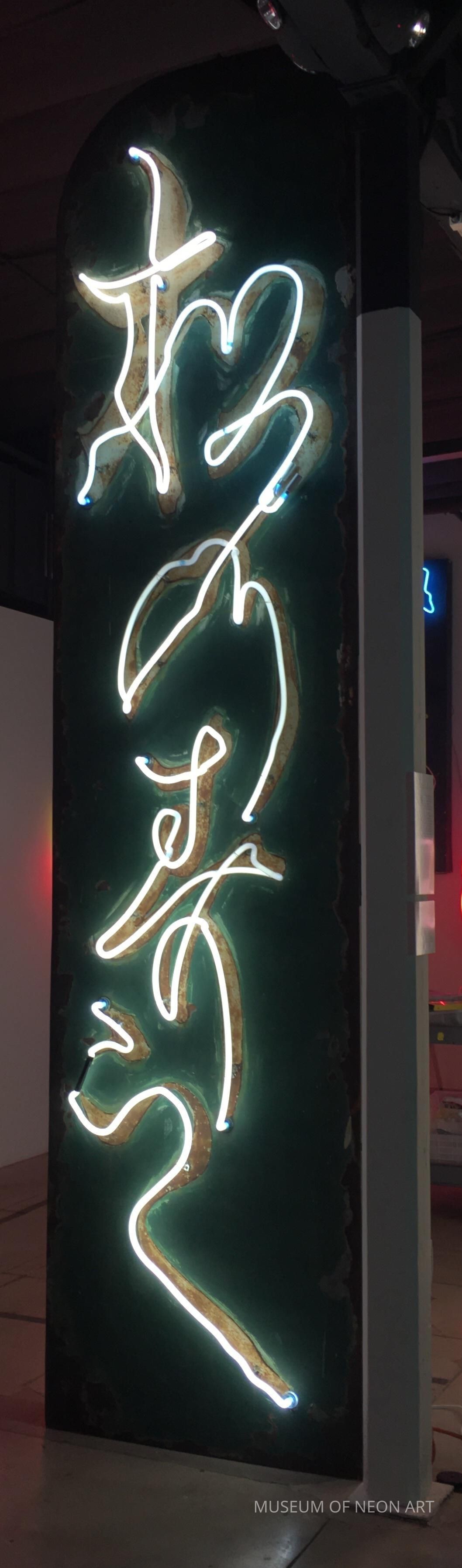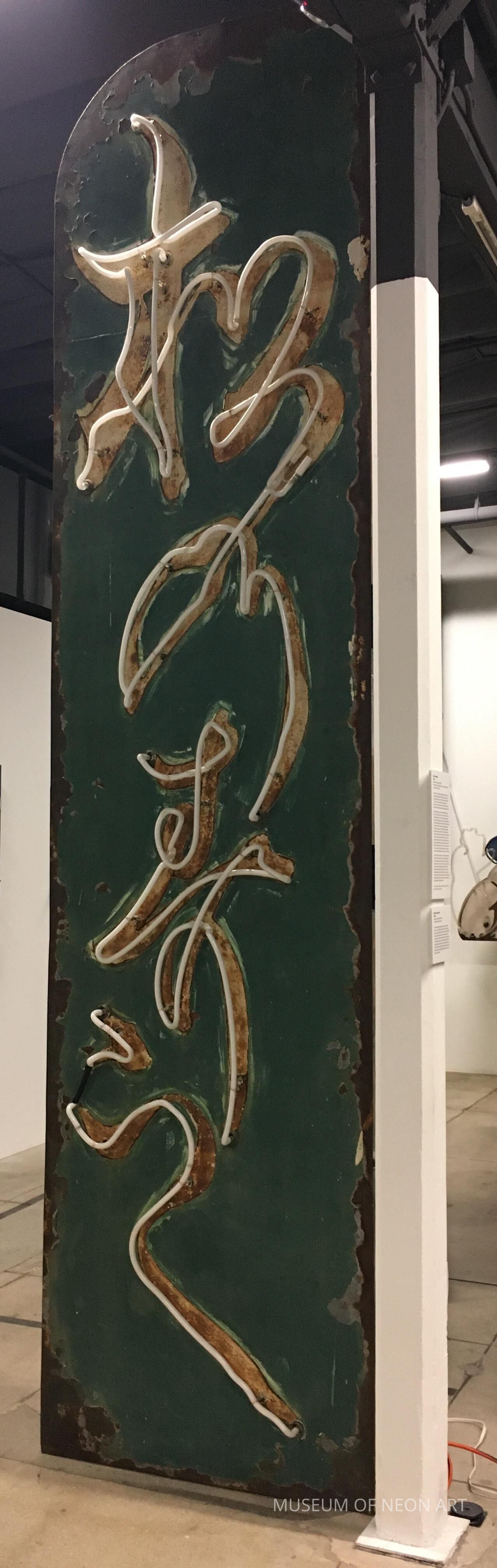 The vertical Kanji and Hiragana (phonetic) Japanese script is in a style called “grass writing” as it resembles blades of grass drawn with a fluid brushstroke. Beautifully designed and executed, this pre-WWII neon sign from Los Angeles’ Little Tokyo neighborhood is extremely rare. For 70 years, the sign never left the building where it was originally displayed. When the sushi restaurant closed in the late 1980s, the family removed the sign and stored it in the backyard of the building until donating the sign to the Museum of Neon Art.