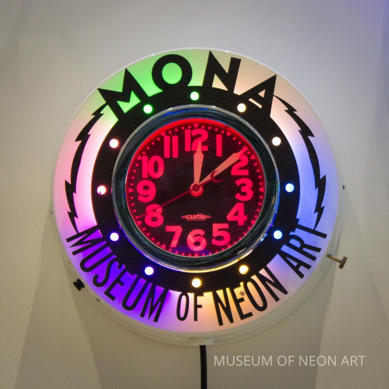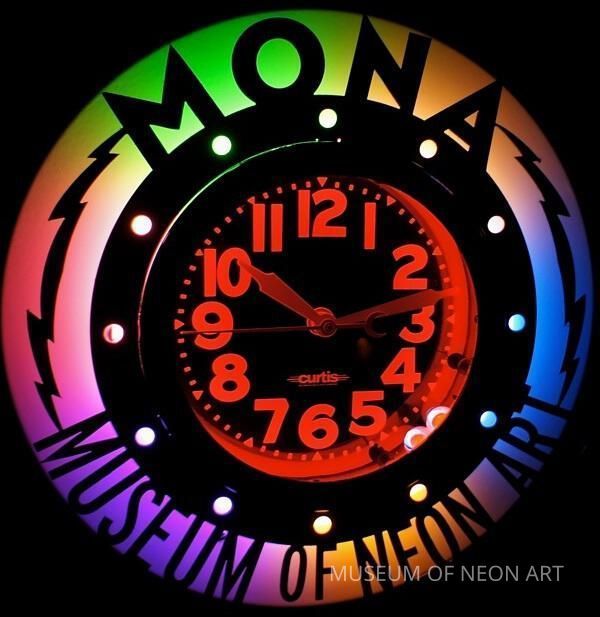Clock made as a prototype for a Museum donor gift at the $5,000 level. Text: "MONA / MUSEUM OF NEON ART"
