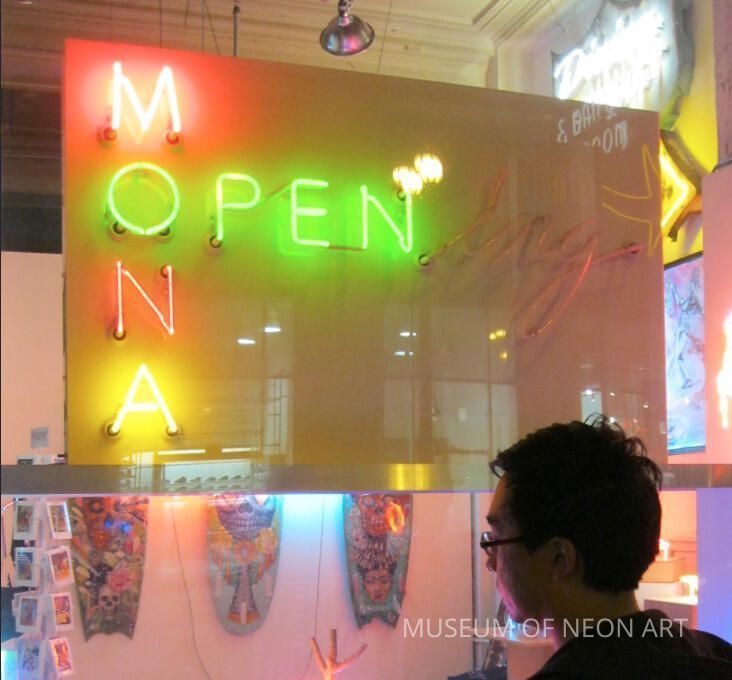 From Olympic Blvd. location. "OPEN" was lit when MONA was open; then the "ing" would also be lit when MONA was holding an art opening. Text: "MONA OPENing"